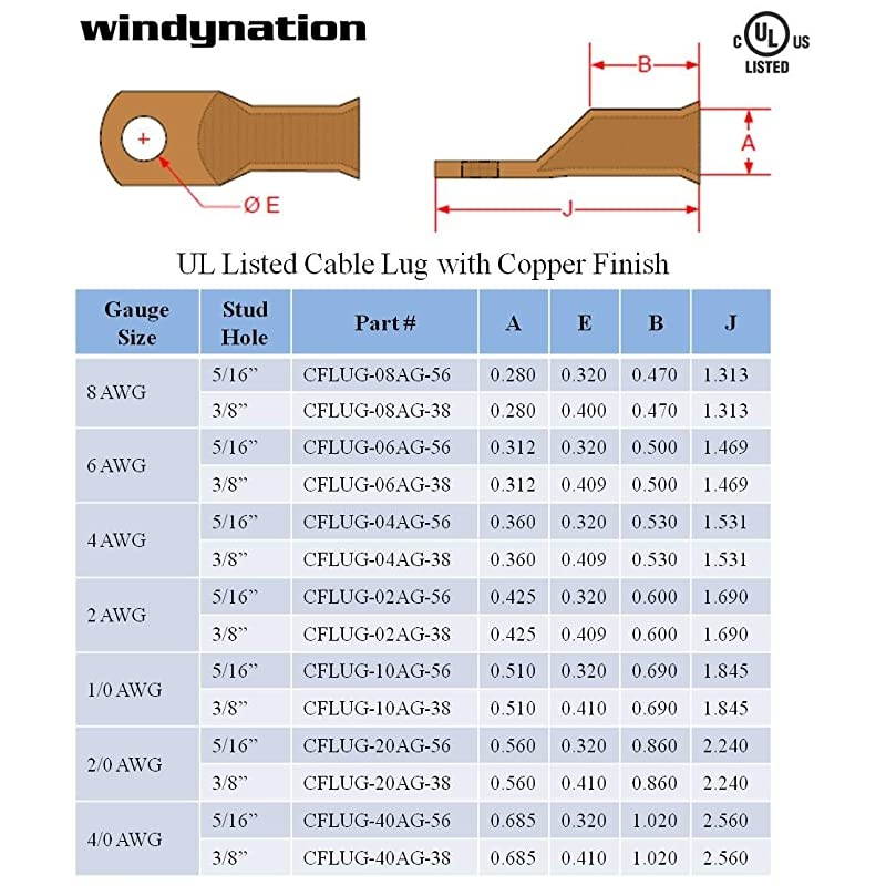 Color: piecesWNI pure copper cable lugs are heavy duty, pure copper, UL Listed electrical connectors designed for high amperage applications. They are an excellent choice for making connections in battery banks, back-up power set-ups, battery to inverter connections, car and audio system wiring, general battery wiring (for golf-carts, RVs, boats, engines, winches, etc), and any other electrical connection that requires a heavy-duty high amperage connection.