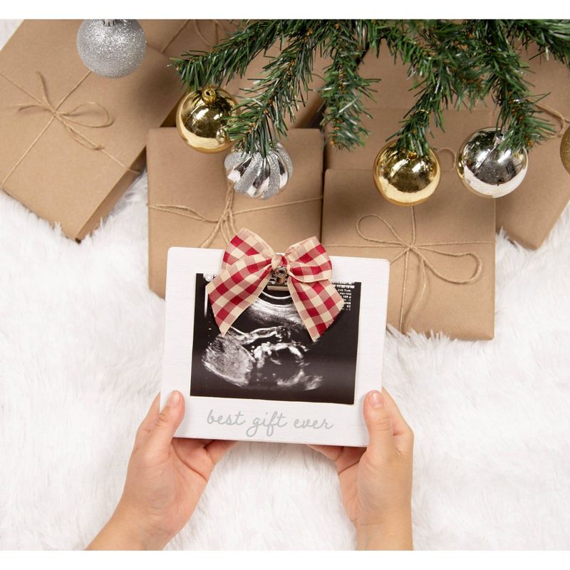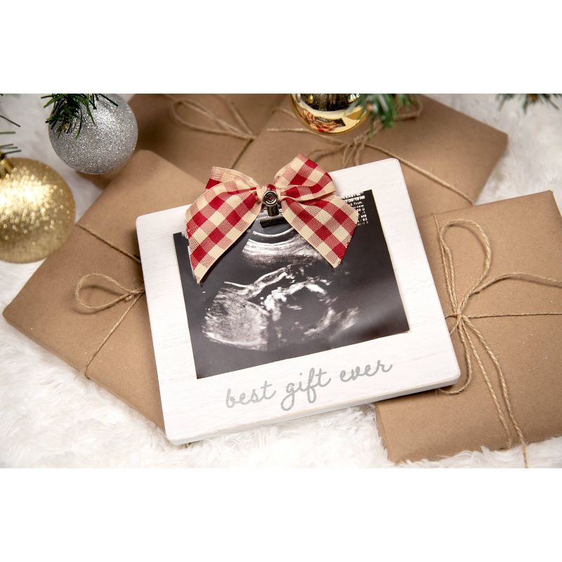 Best gift ever! Pearhead’s sonogram frame is the perfect holiday frame for celebrating your new arrival. This wooden frame includes a silver clip to display your baby’s first 4” x 5” sonogram and “best gift ever” is printed in gray on the bottom. This rustic, trendy frame also includes an adorable red and white ribbon. Have fun clipping in your baby’s sonogram frame below the ribbon to add an adorable finishing touch. Each season you bring this frame out and decorate around your home, you will be able to remember the joy of that first holiday season expecting your little one. Or keep this special frame out year-round to celebrate your little bundle on the way. The frame includes a triangle clip and easel to easily hang around your home or place on any desk or tabletop. Just find out you’re expecting? Use this adorable frame as your pregnancy announcement! This frame also makes a great holiday gift! Have fun putting the sonogram picture inside, wrapping up, and gifting to your family. Or you can put it in your other half’s stocking for a fun surprise! And don’t forget to add this frame to your baby registry. Whether you’re expecting around the holidays or just enjoy the holidays, this frame makes the perfect baby shower present! And it’s great for boys or girls! Every holiday you will forever be able to cherish the moment you knew you were going to be a parent, celebrate that moment with Pearhead’s sonogram frame.
