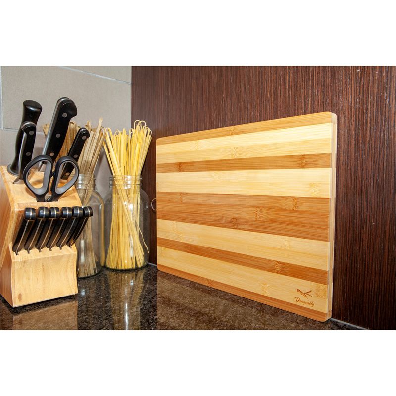 The horizontal-grain texture on this chopping board helps you hold vegetables and meat in place so you can slice precisely; this helps you make even cuts of food so it can cook or grill more evenly.Features : 100% Organic Natural Bamboo; Handle for easy storage and extra grip; Knife friendly; Finish: Brown and Natural; Material: Bamboo; For residential use; 1 year limited warranty; Easy to clean; Horizontal-grain texture to help hold veggies, meats, breads and cheeses in place. Specifications : Product Dimensions : 0.75"" H x 15.75"" W x 11.81"" D.