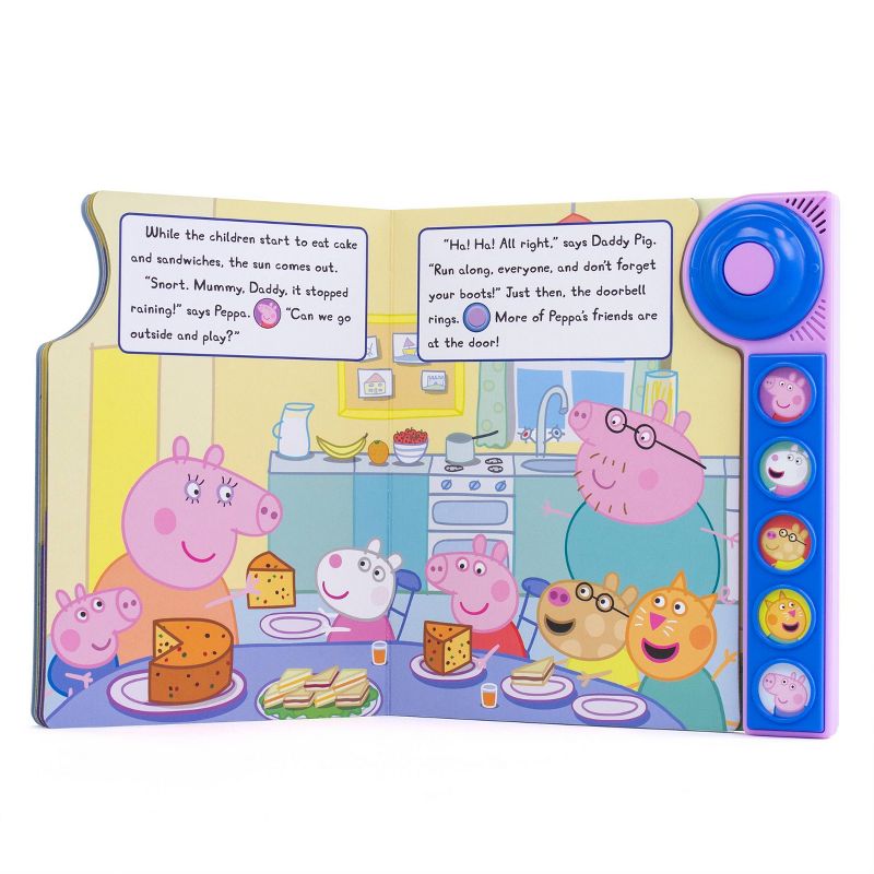 Maybe rainy days aren't so bad after all! Ring the doorbell sound button and read to find out which friends attend Peppa's rainy day picnic! Join Peppa and guests while they play with Candy Cat's ball; eat yummy cake; and jump in big, muddy puddles. Readers will also love hearing and interacting with the character voices of Peppa Pig, Suzy Sheep, Pedro Pony, Candy Cat, and George through five additional sound buttons.Book Synopsis