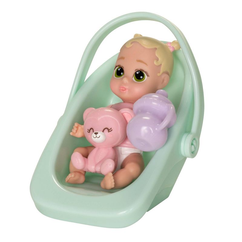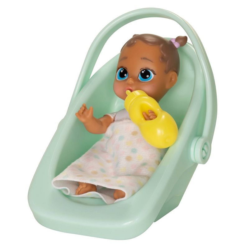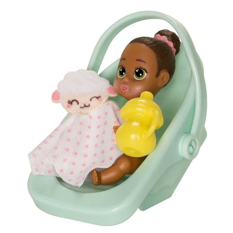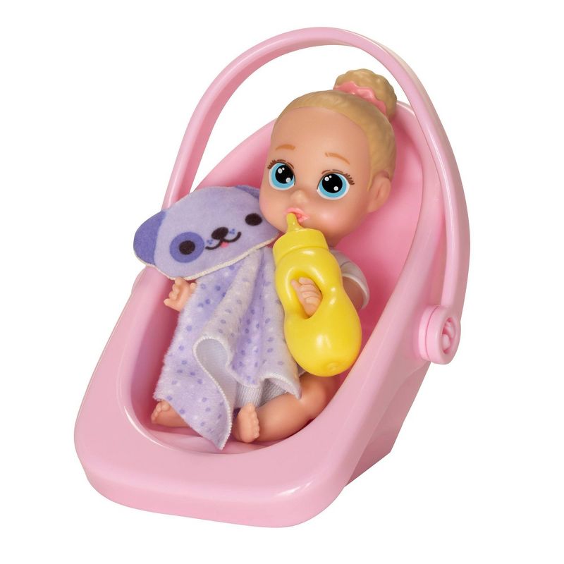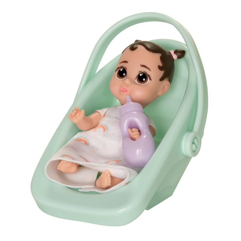 •Includes a 4" doll, a carrier, a blanket, lovey or Teddy bear, and a bottle or sippy cup