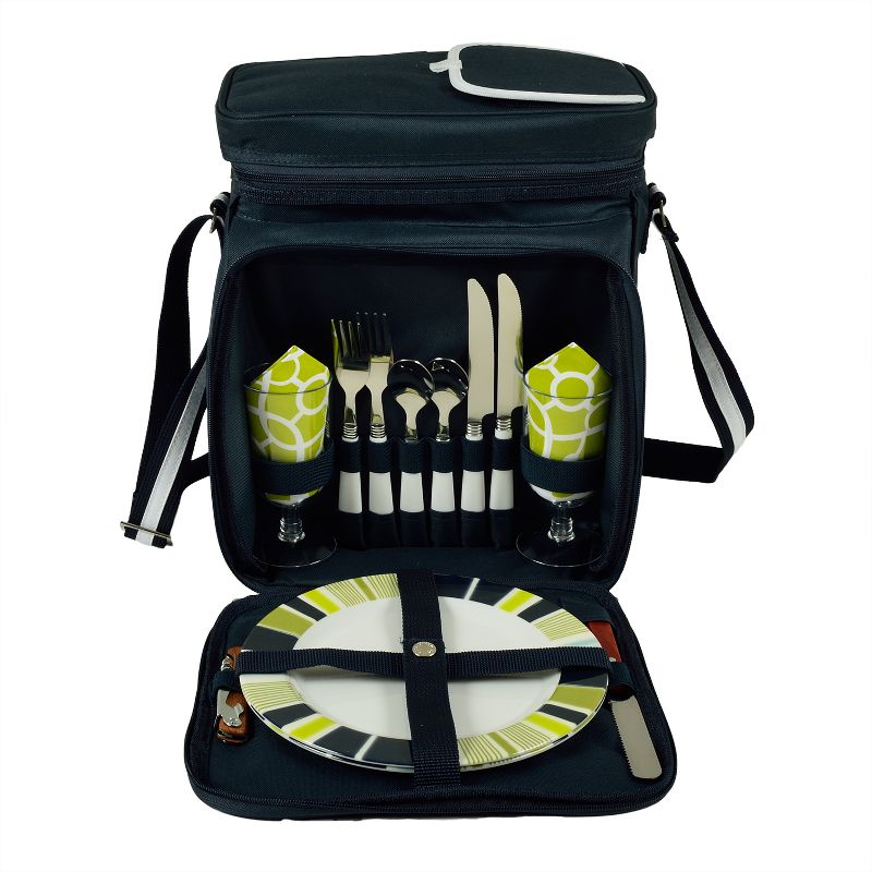 Fully equipped picnic basket cooler for two. Unique, divided Thermal Shield insulated cooler with separate sections for wine and food. Divider can be detached and folded to the back when a larger cooler space is needed. Easy access panel in lid for drink storage. The cooler is leak proof with heat sealed seams and can be used with ice to extend cooling. Lining is food safe easy to clean PEVA. Includes - (2) coordinating 9" melamine plates, (2) 13" x 13" cotton napkins, (2) sets of top quality stainless steel/ABS handle flatware (fork, knife, spoon), (2) 8 oz. acrylic wine glasses, (1) 8" cheese knife, (1) combination corkscrew/bottle opener. Features an adjustable shoulder strap, extra front pocket. Dishes, glasses, flatware are all dishwasher safe. This compact picnic set makes a great wedding gift