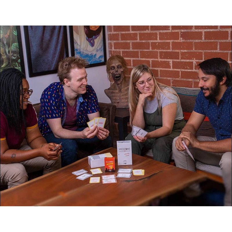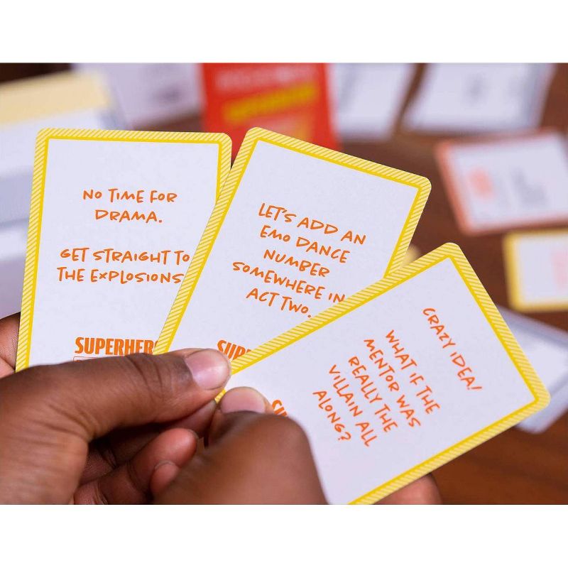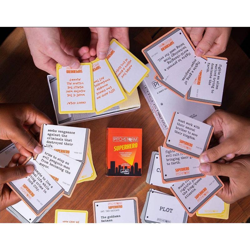 THE TIME FOR EARTH’S MIGHTIEST. Superhero is an expansion deck for Pitchstorm: a party game that puts you in the position of an unprepared writer pitching movies to the world's worst executives. Writers have to pitch their superhero movie idea, and figure out a way to incorporate the random notes thrown by the executives on the spot.
