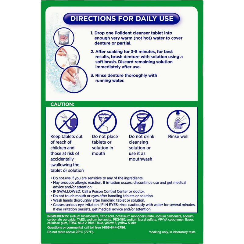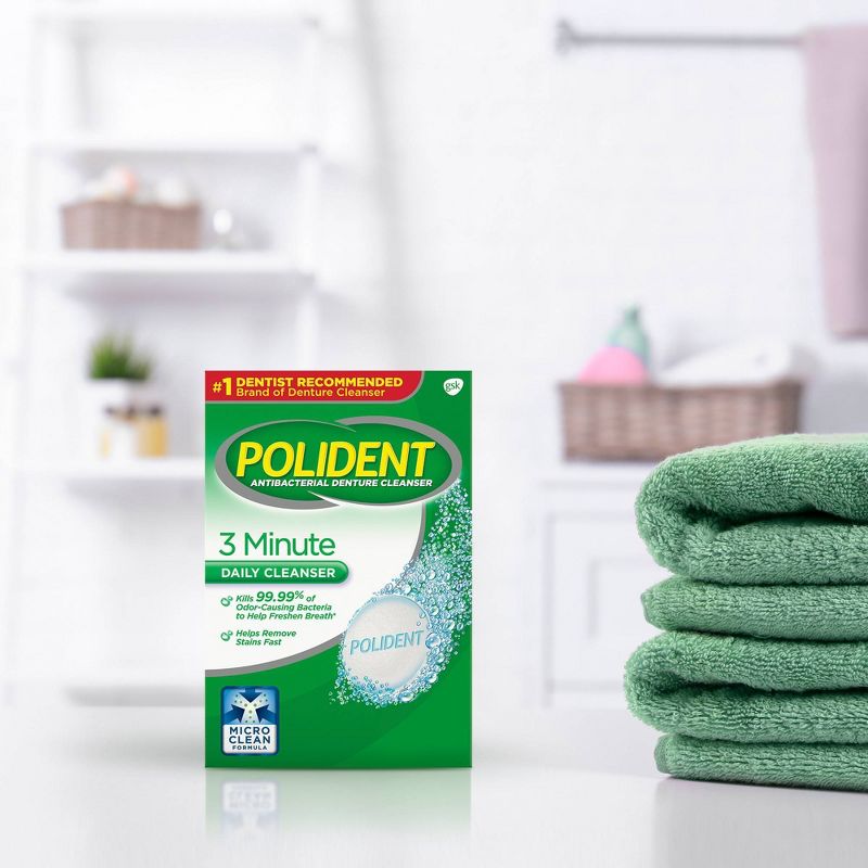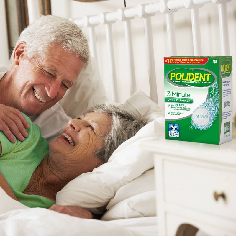 3 Minute DAILY CLEANSER TRIPLE MINT FRESHNESS #1 DENTIST RECOMMENDED Brand of Denture Cleanser Kills 99.99% of Odor-Causing Bacteria to Help Freshen Breath*. Helps Remove Stains Fast. Why clean with Polident instead of toothpaste? Dentures are about 10x softer than natural teeth. Toothpaste contains abrasives that can scratch the denture surface. Bacteria, which can cause odor, can grow in those scratches. Unlike toothpaste, Polident MicroClean Formula kills 99.99% of odor-causing bacteria in just 3 minutes.* POLIDENT MICROCLEAN FORMULA works in 3 ways: • Kills odor-causing bacteria • Cleans without scratching • Removes stains Denture hygiene is an important part of good oral health. Use Polident with your dentures instead of toothpaste every day. *soaking only, in laboratory tests **when used as directed