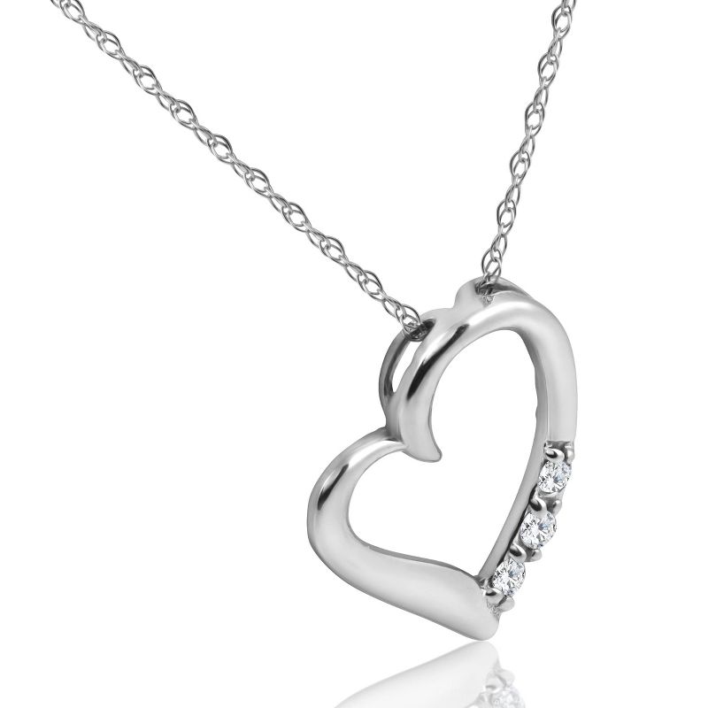 This classic heart pendant features 3 round brilliant cut natural diamonds. An 18" 10k white gold clasp lock chain is included. All diamonds are set in solid white gold.