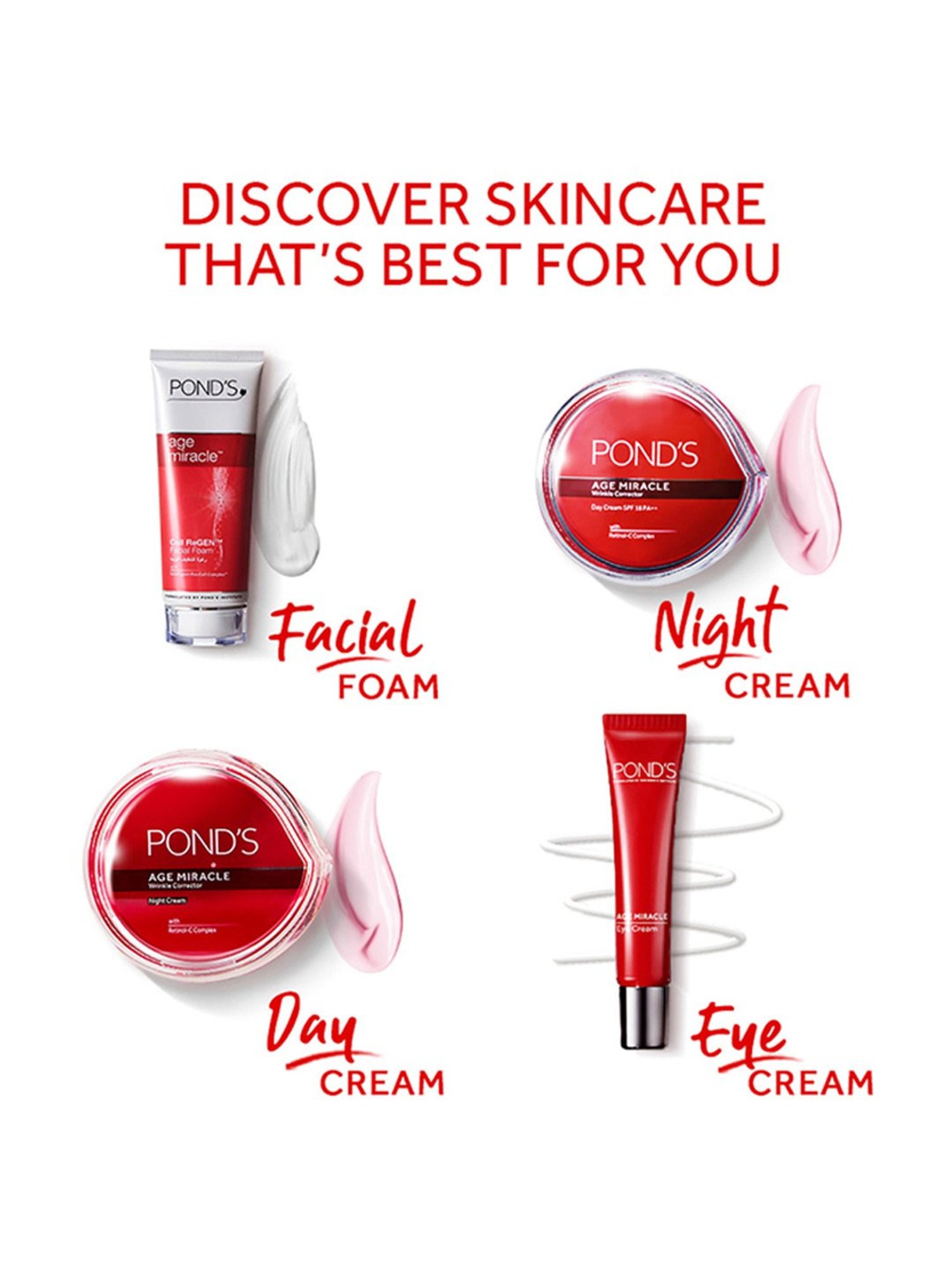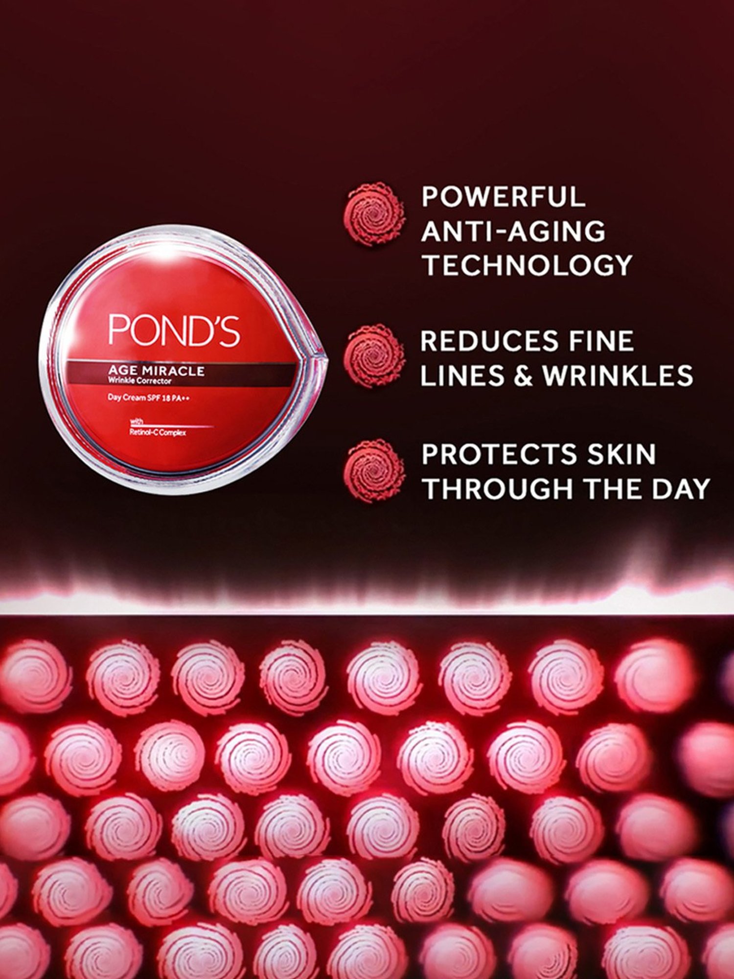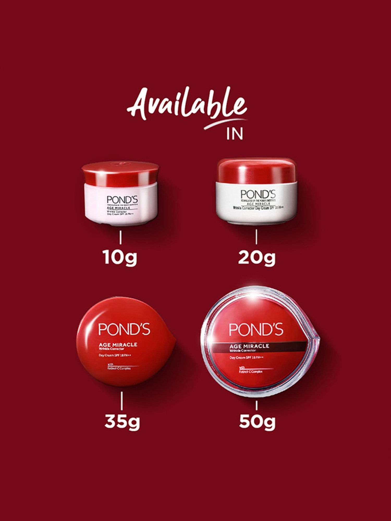 Day in and day out external influences like UV, pollution and stress can speed up the skins natural aging process, resulting in a greater than normal loss of collagen and elastic fibers. Pond's Age Miracle Wrinkle Corrector Day Cream SPF 18 PA++ is an anti ageing day cream made with Pond's most advanced technology. Retinol-C complex, that penetrates the skin continuously to release powerful anti-ageing retinoid actives for 24hr non-stop. It can help reduce the appearance of fine lines and wrinkles from the inside, leaving skin softer, more moisturized and youthfully radiant on the outside.