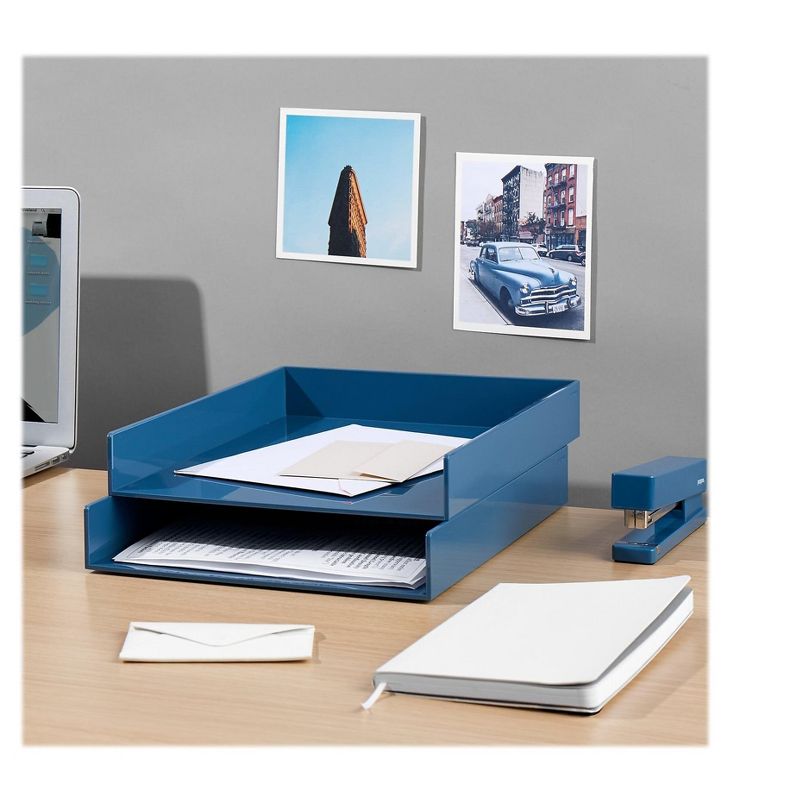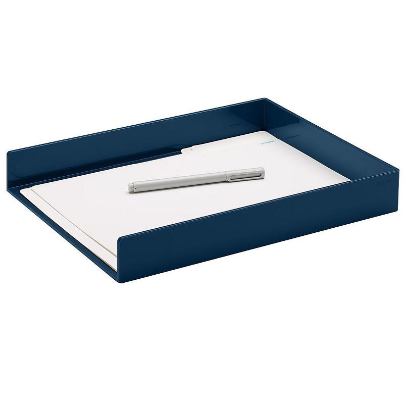 Poppin Stackable Front Loading Letter Tray. Save space around your desk with this front-loading letter tray. Comes in slate blue. Dimensions: 1.75"H x 9.75"W x 12.5"D. Single compartment for easy access. Lacquer-like finish. If you've got a lot of papers, stack these letter trays high. Sold as 1 Each.