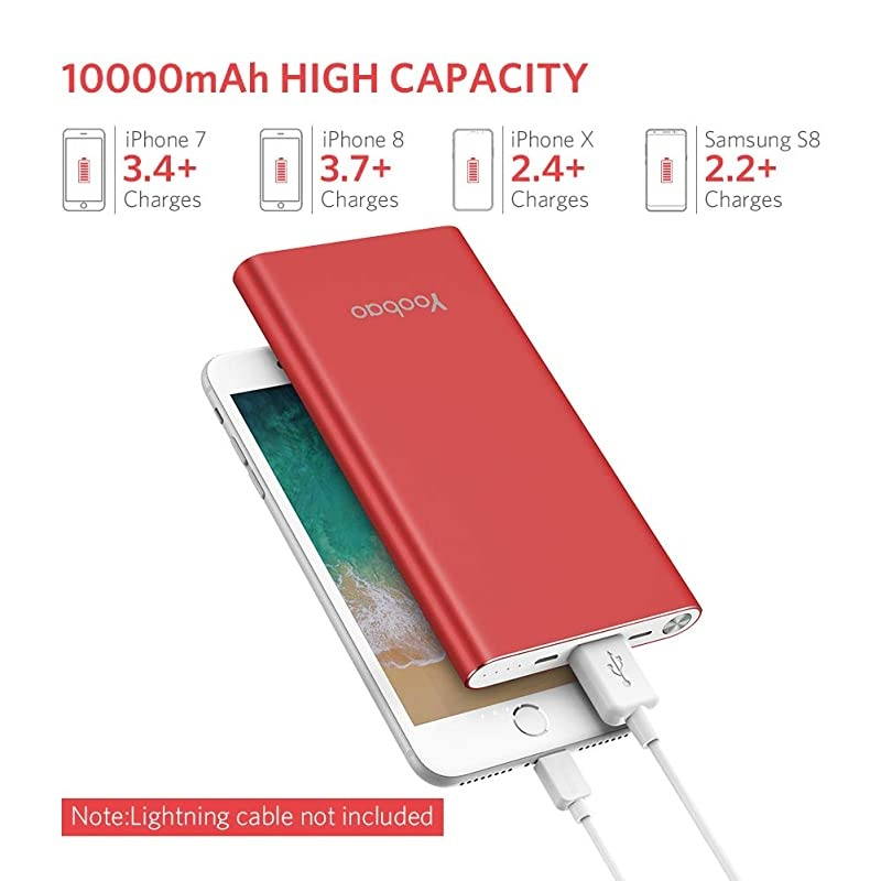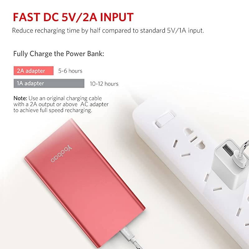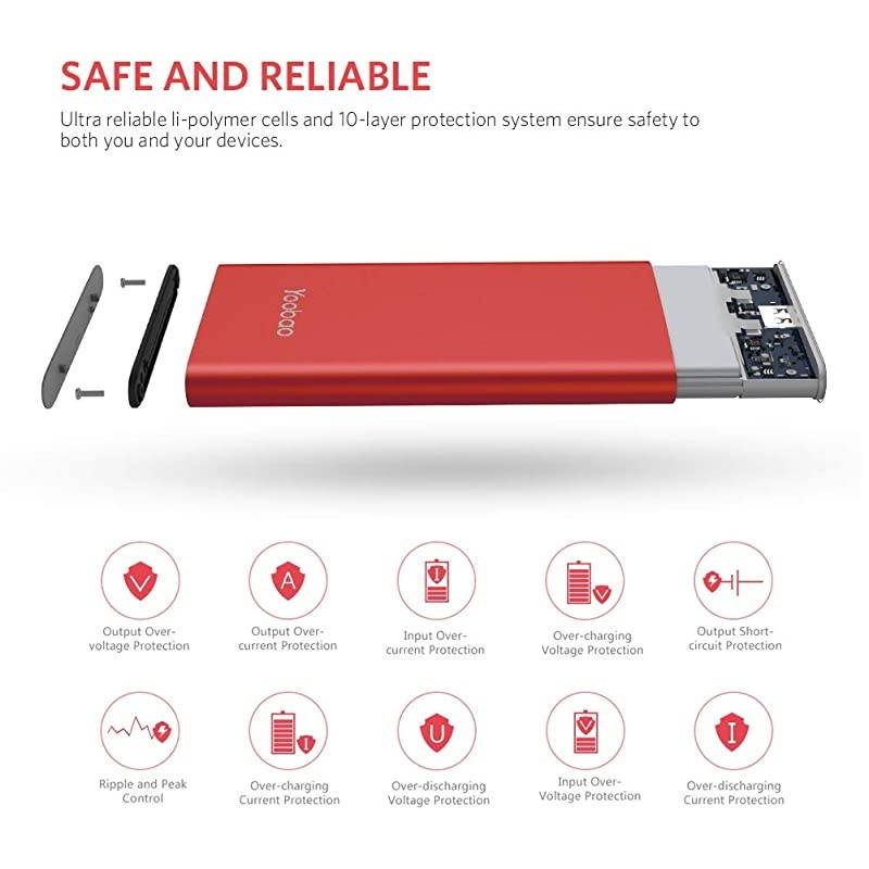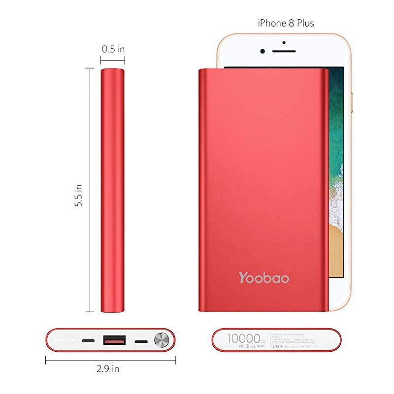 (Note: Apple charging cable is not included). *****Slim and Lightweight - One of the thinnest 10000mah power bank on the market, Only 5.5 x 2.9 x 0.5 inch size and 9.1 oz weight. *****Exquisite Craftsmanship - Integrated aviation aluminum alloy shell, sleek, stylish and beautiful. Sandblasting oxidation treatment on surface to anti fingerprint and scratch. *****Safe to Use - Ultra reliable grade A+ li-polymer cells and premium microchips ensure safety and durability. 10-layer protection system provides surge protection, termperature control and more advanced safeguards to protect both you and your devices. *****What You Get - 1x A1 10000mAh Power Bank, 1x Micro
