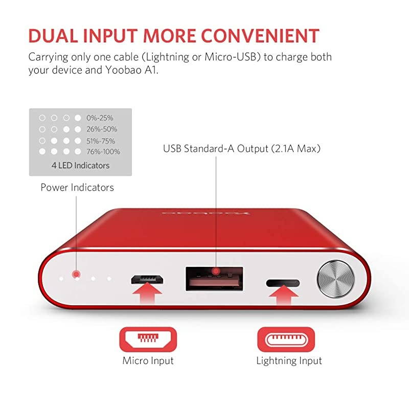 **********Dual Input - No matter whichever cable you are carrying, you can recharge the power bank with either the attached micro-USB cable or your own Apple cable.