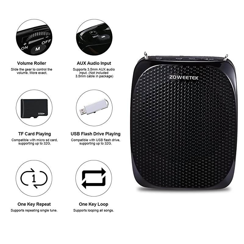 *****Supports MP3 audio playing: TF (Micro SD) card playing & USB flash drive playing. Can repeat single tune, loop all music and switch songs. Supporting 3. 5mm AUX audio input (Mic port can be used as AUX port), can work as a wired speaker. *****The wired headworn microphone is adjustable. You can adjust the distance between your mouth and the mic. Made of durable and wear-resistant