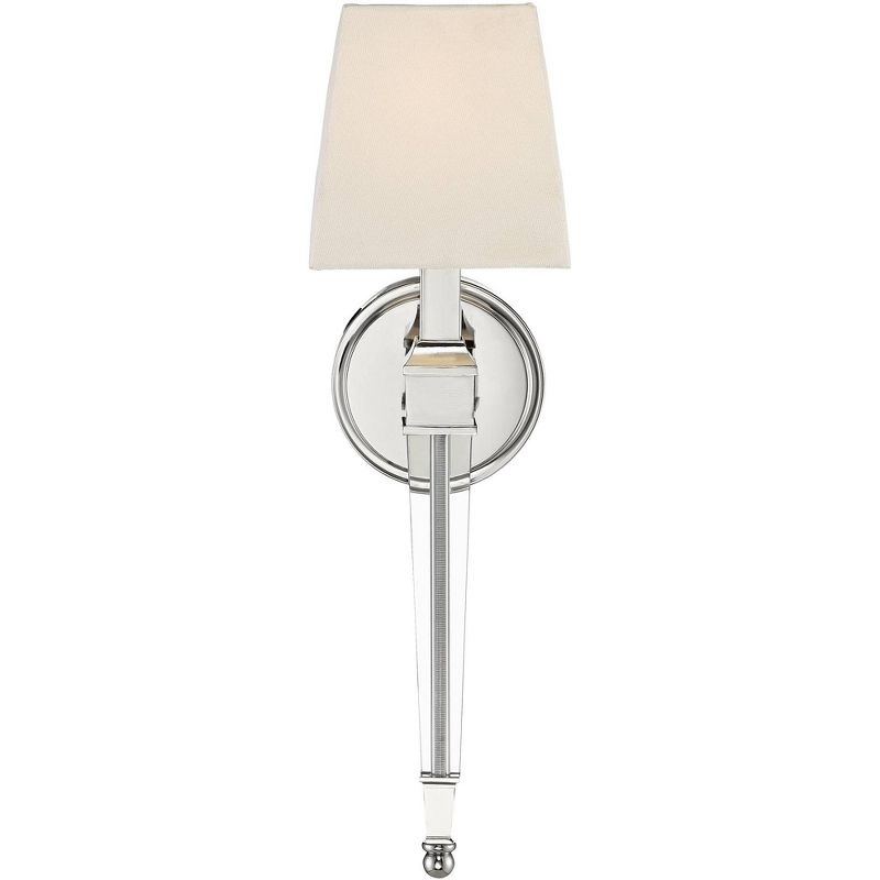 This transitional wall sconce design is a handsome upgrade for traditional to contemporary style living spaces. Crisp, clean lines come together to form the stately look, with polished nickel finish elegantly complemented by a white fabric shade and clear acrylic arm. From Possini Euro Design.