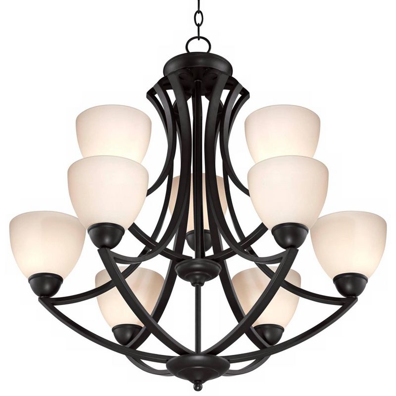 This nine-light chandelier offers an updated take on classic chandelier form. It features a lustrous dark bronze finish with light glowing from within white frosted glass. Complete a kitchen or dining room with this impressive ceiling light from the Milbury Collection.