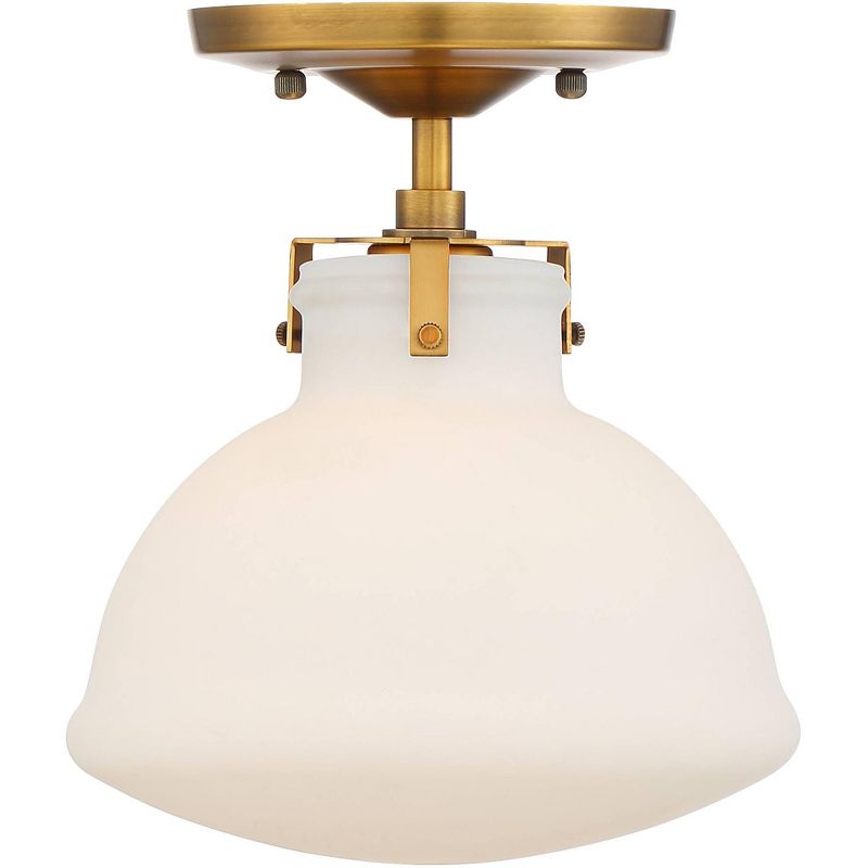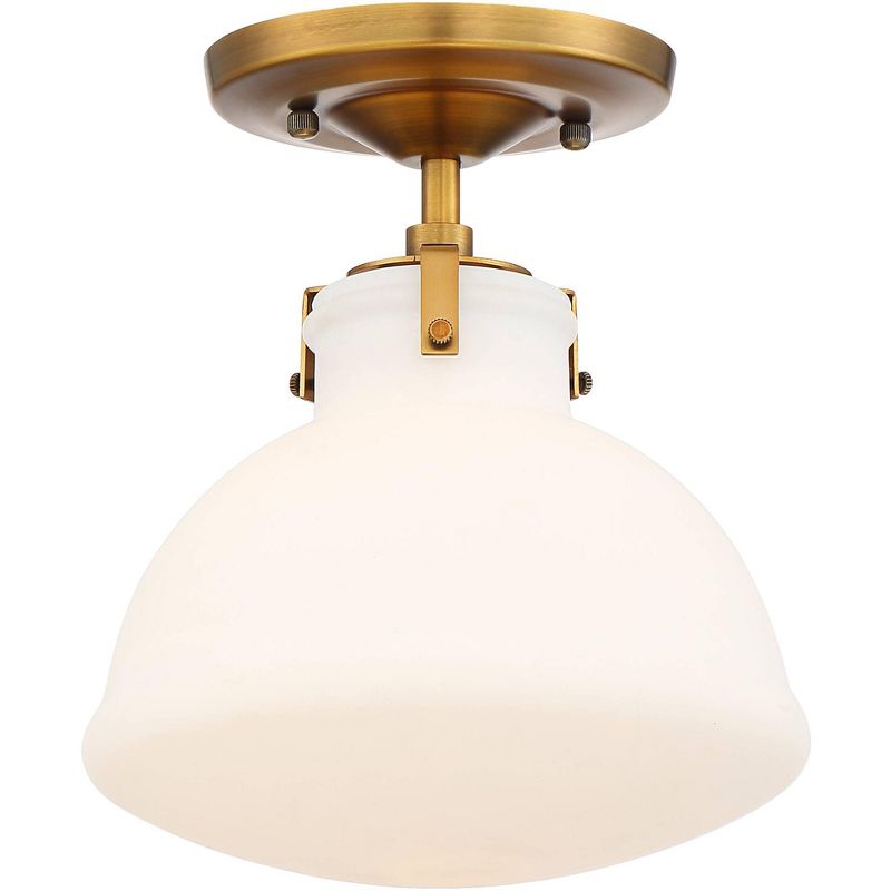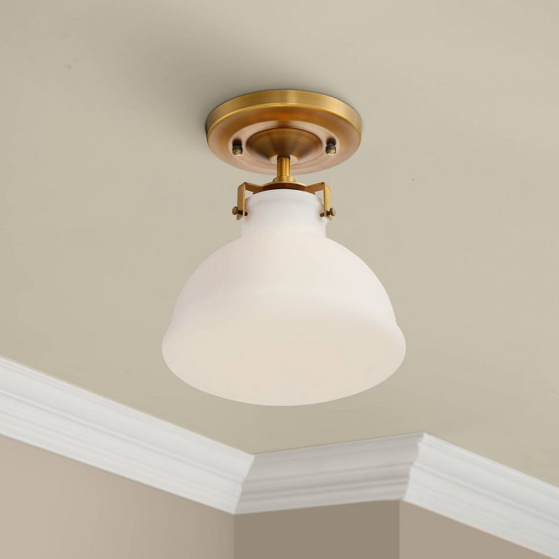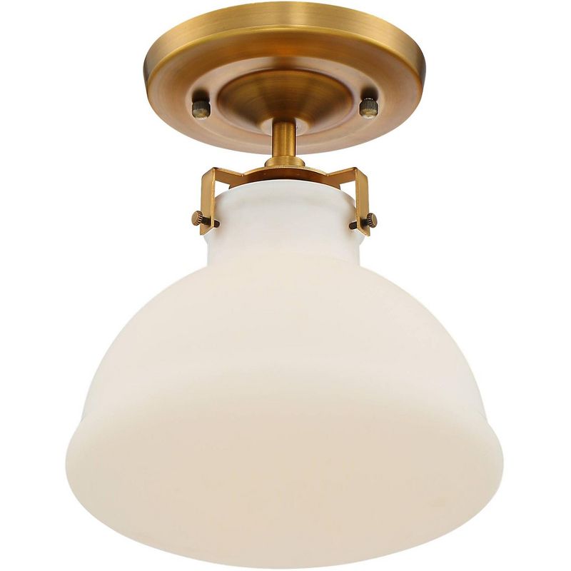 A semi-flushmount ceiling light that's perfect for living rooms, bedrooms, closet spaces, hallways, and more. This fixture comes in a gold finish frame, which supports a shapely opal glass shade that hangs from the bottom. Add Mid-Century Modern lighting to your home with this lovely ceiling light design.