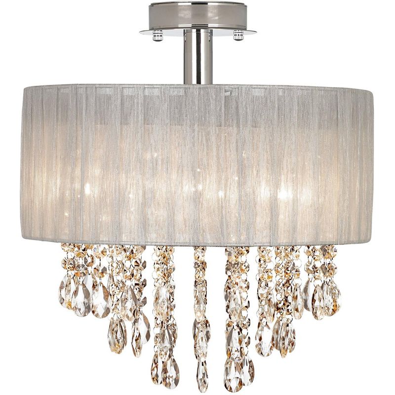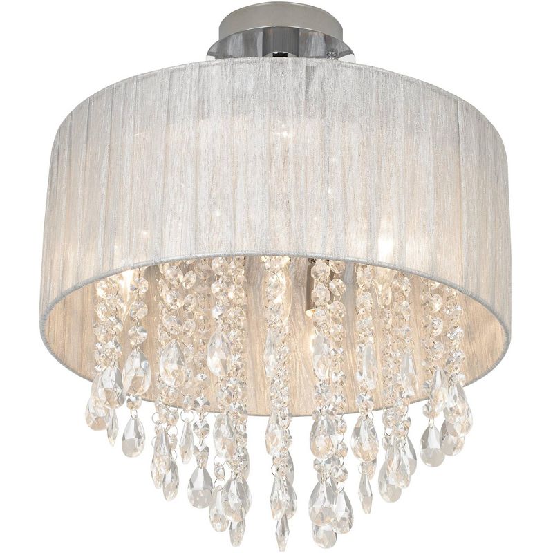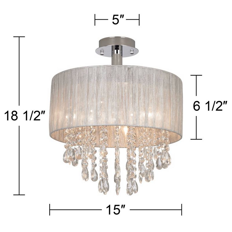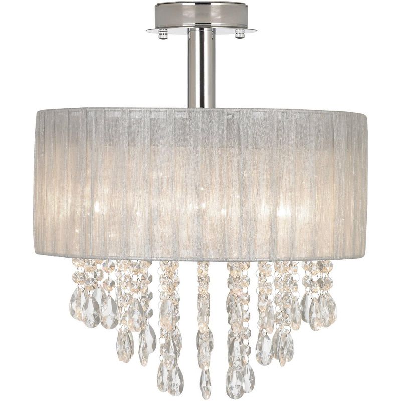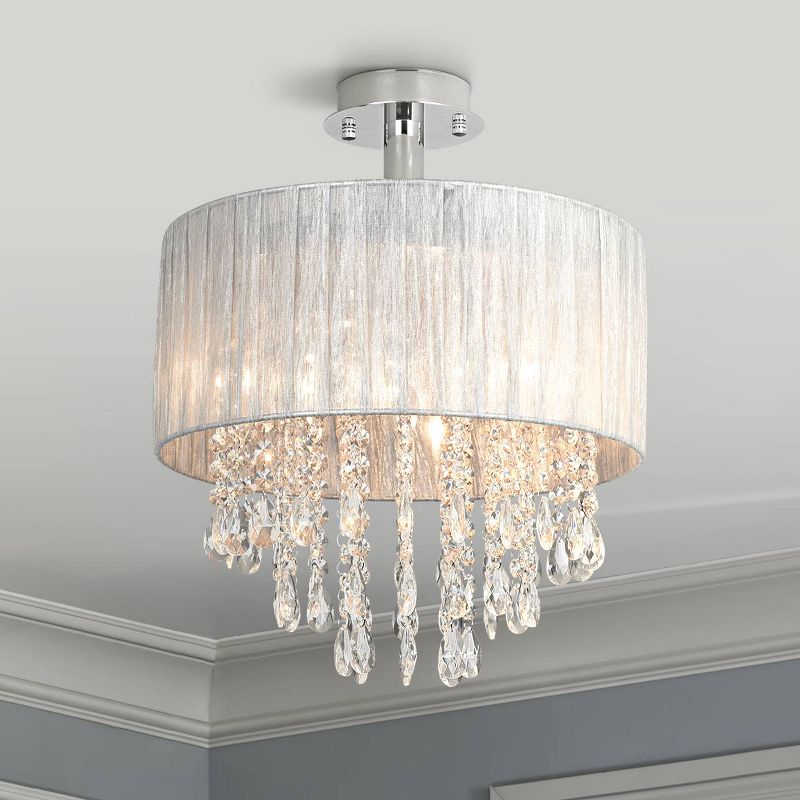 The perfect fixture for a formal dining or seating area. This semi-flushmount ceiling light comes with a sheer silver drum shade that offers a beautiful semi-transparent look. Strands of faceted crystals hang down from the shade for a sparkling effect, and gleaming chrome finish hardware completes this elegant design.