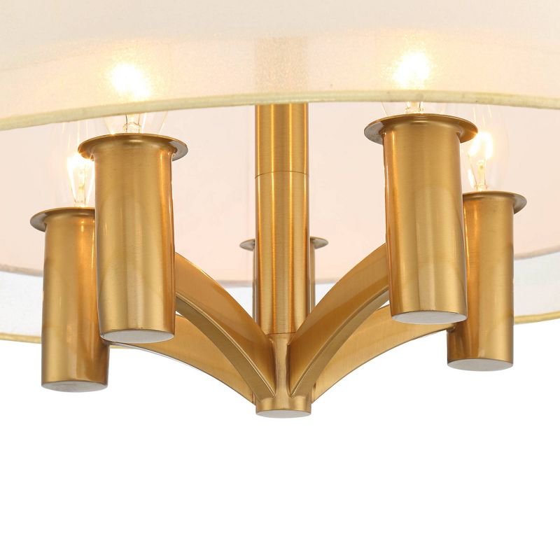 This semi-flushmount ceiling light offers a chic and simple design. It has a double drum shade, with a sheer outer shade over a white linen shade, and is enhanced by gentle warm brass accents. The result is an elegant look, perfect for living room, dining room, or kitchen.
