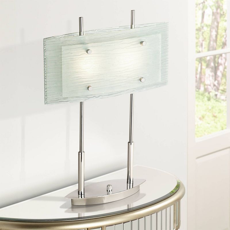 This sleek and beautiful desk lamp features frosted slumped glass, a technique that produces unique and gorgeous results. Four panes of glass surround halogen bulbs to create a distinctive lighting effect. The twin post base comes in a lustrous chrome and satin nickel finish. A full range dimmer on the base allows you full lighting control, making this perfect for a desktop setting.
