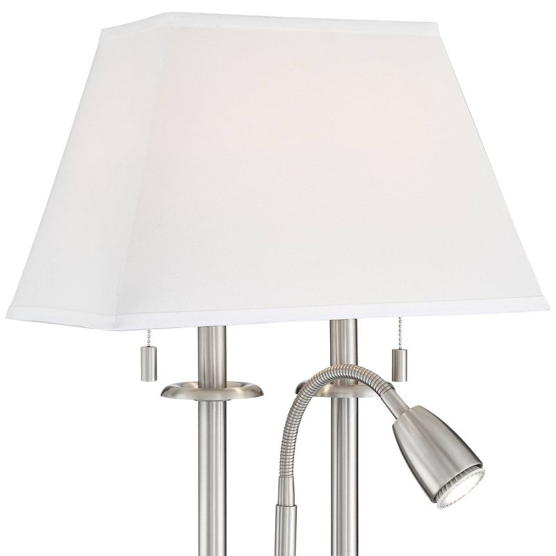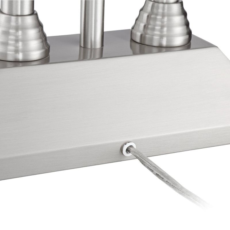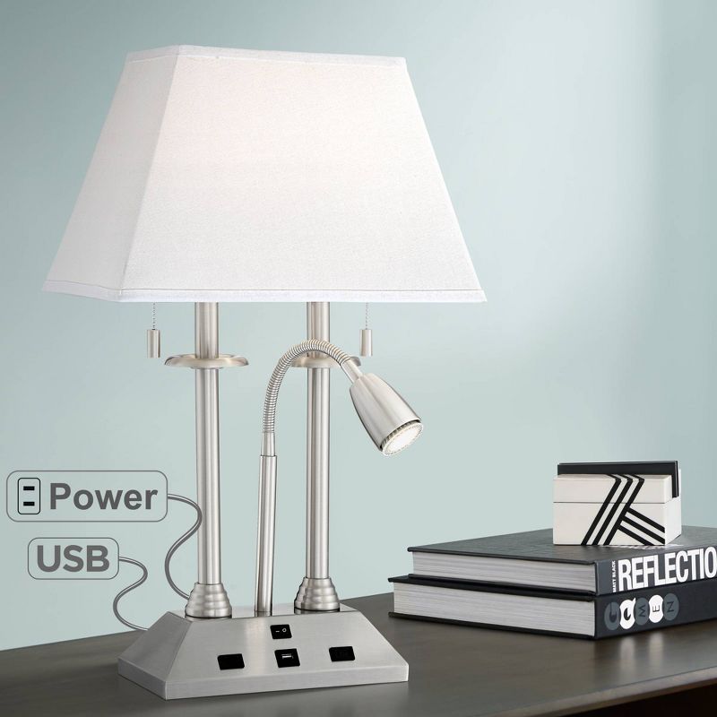 An elegant, contemporary look, this desk lamp adds convenience to any space. Featuring two outlets and a USB port, this lamp makes it easy for you to charge smart devices. It also comes with an LED gooseneck reading light. A beautiful brushed nickel finish completes the design.