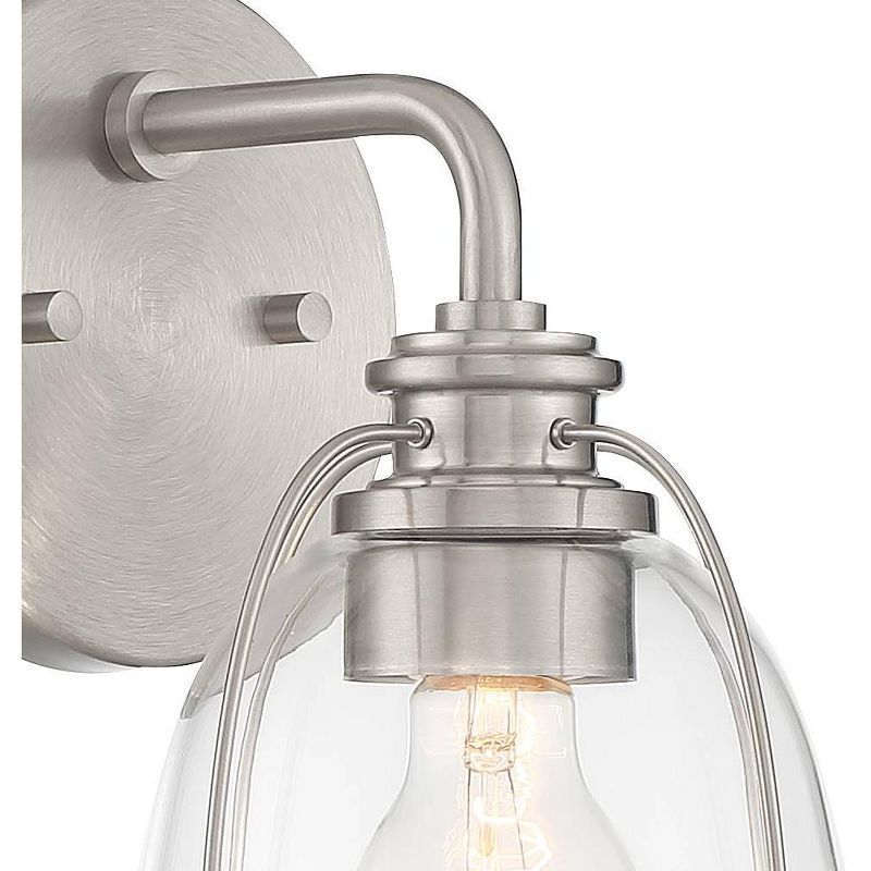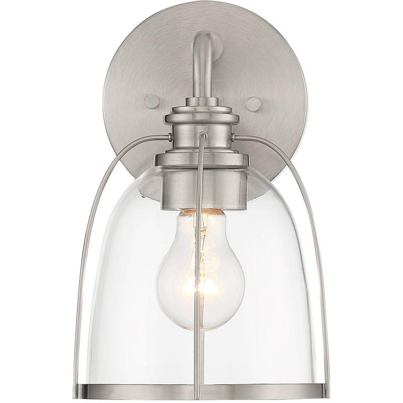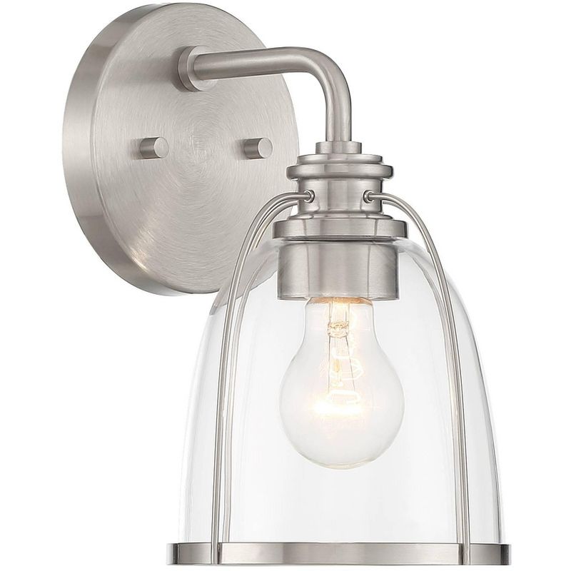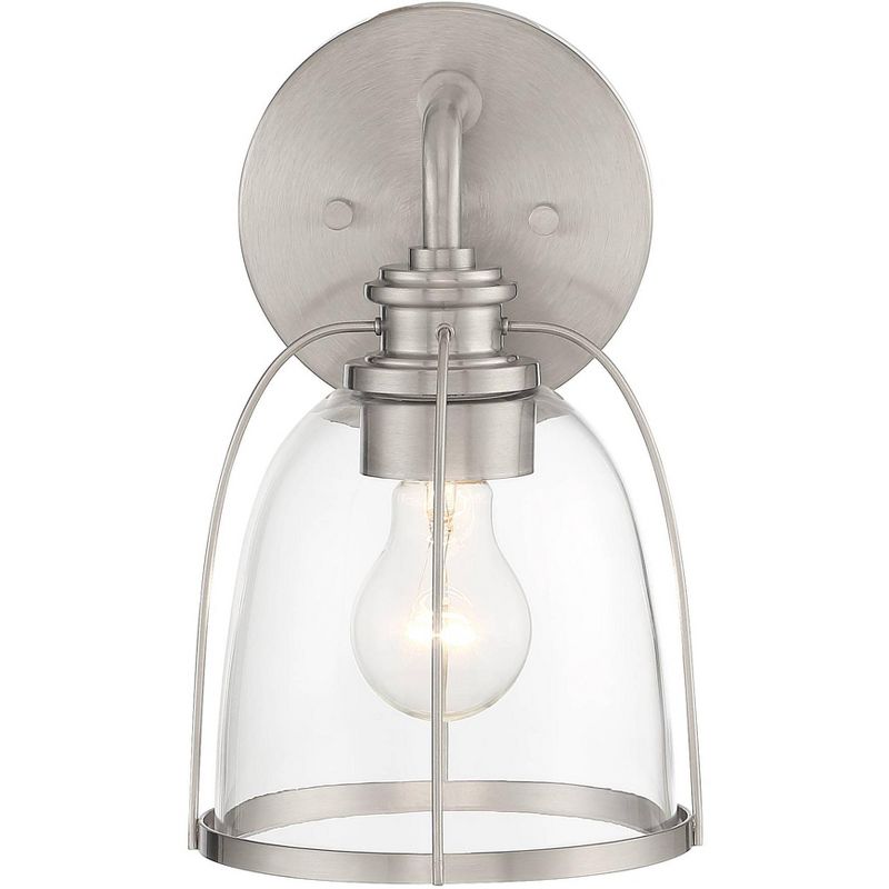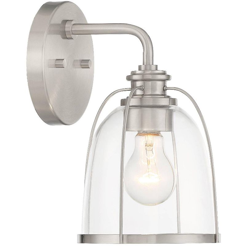 Simple and stylish, this modern wall sconce from the Possini Euro Design brand is perfect for everyday application. With a sleek brushed nickel finish frame, it blends contemporary and industrial tastes. The single light is encased in a clear glass shade and four curved bars with subtle folding at the bottom.