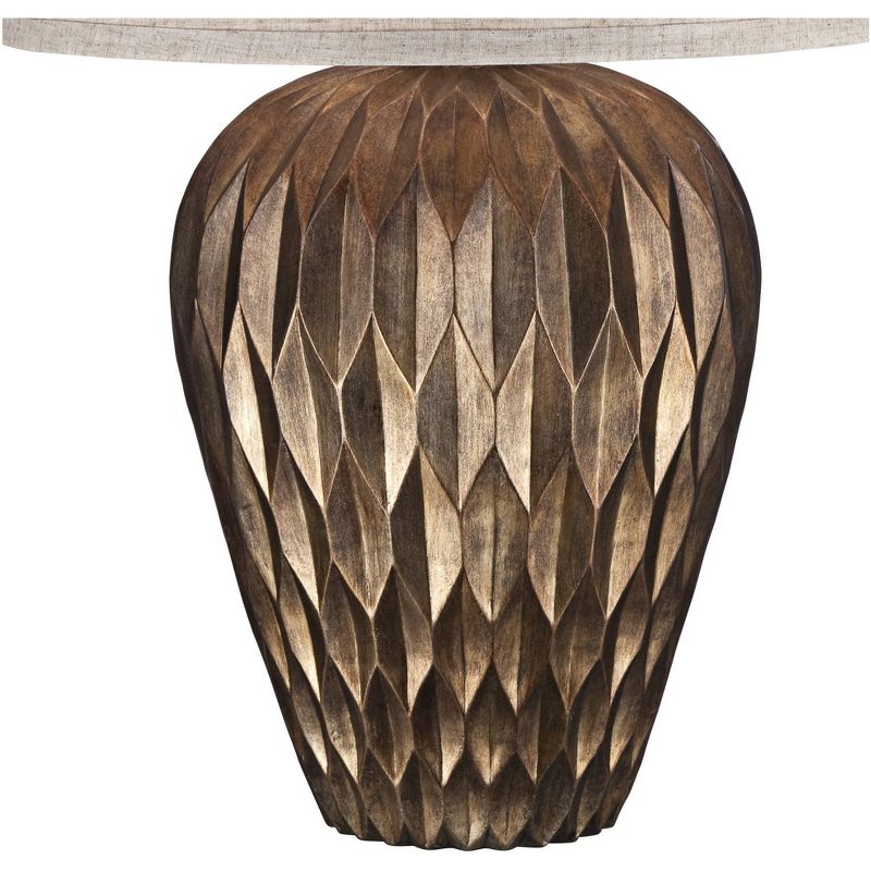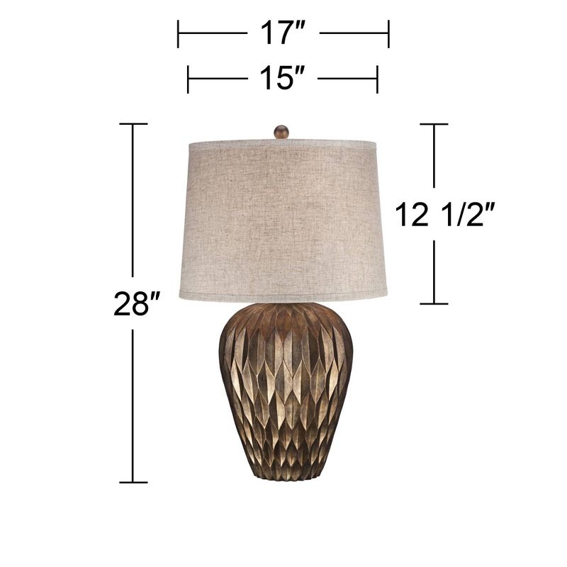 This delightful warm bronze finish table lamp features a modern urn shape body textured in a wonderful dimple motif that emulates folded paper lanterns. A simple drum shade and a bronze finish round finial complete this versatile look. Able to accommodate a high-wattage bulb, the design is both stylish and functional as a reading light.