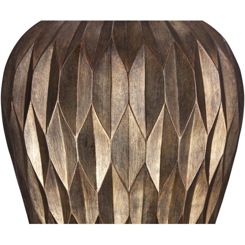 • Bronze finish over cast resin construction. Geometric patterned body.