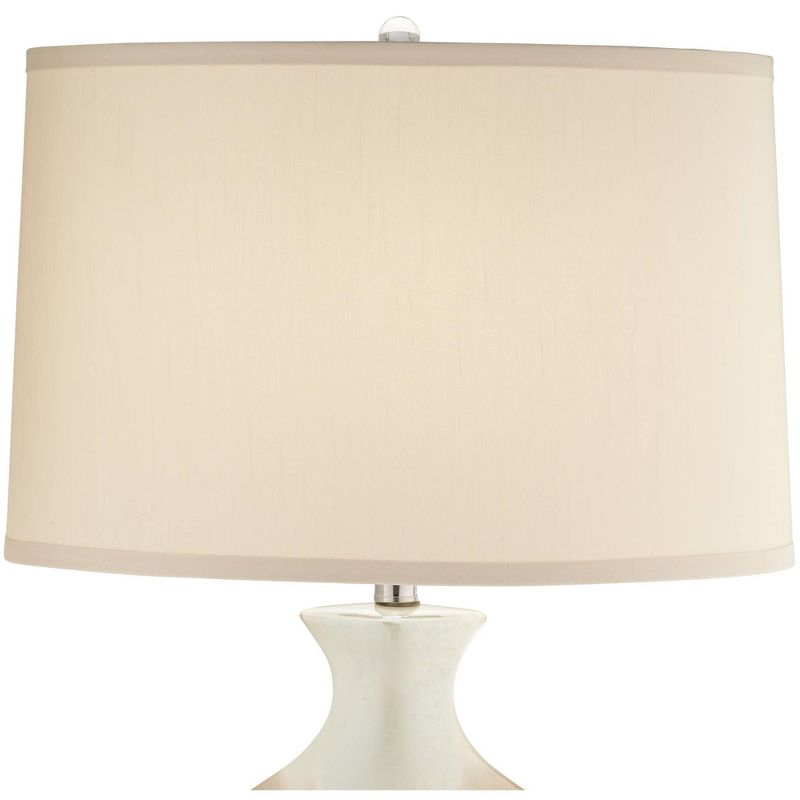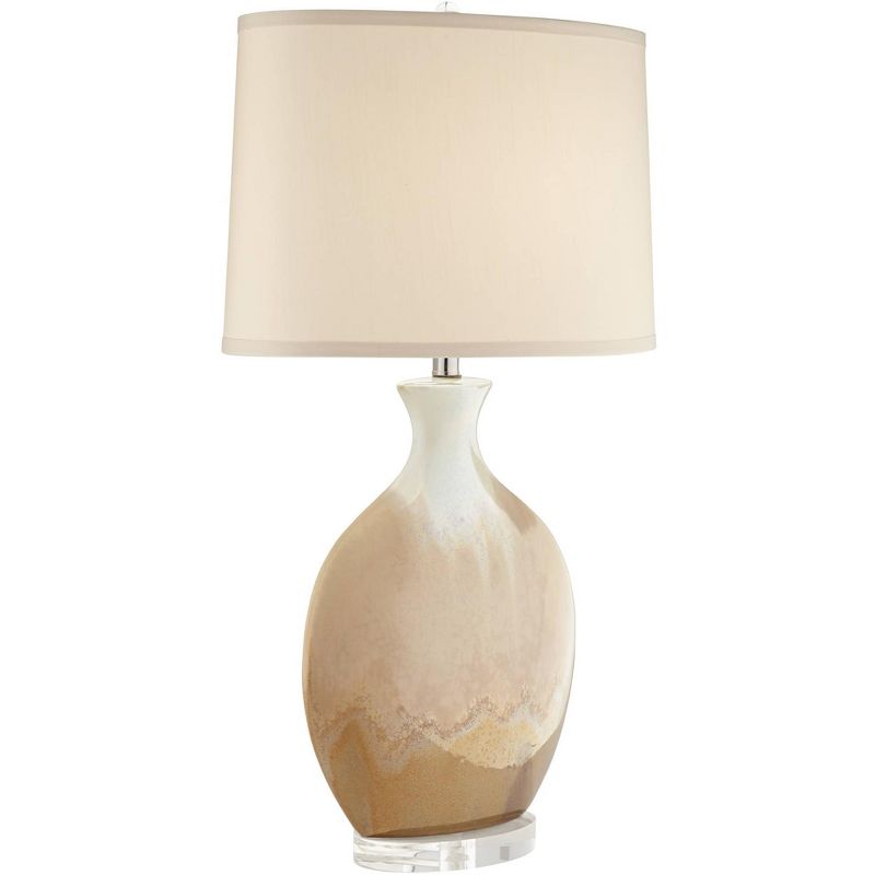 An ivory drip detail in the finish of the Marci round table lamp creates an intriguing pattern. Crafted in ceramic material and topped with a drum shade, its round acrylic base completes the modern design. Please note: since each ceramic base is handmade and has a hand-applied drip glaze, the final finish color and pattern will vary slightly from lamp to lamp.