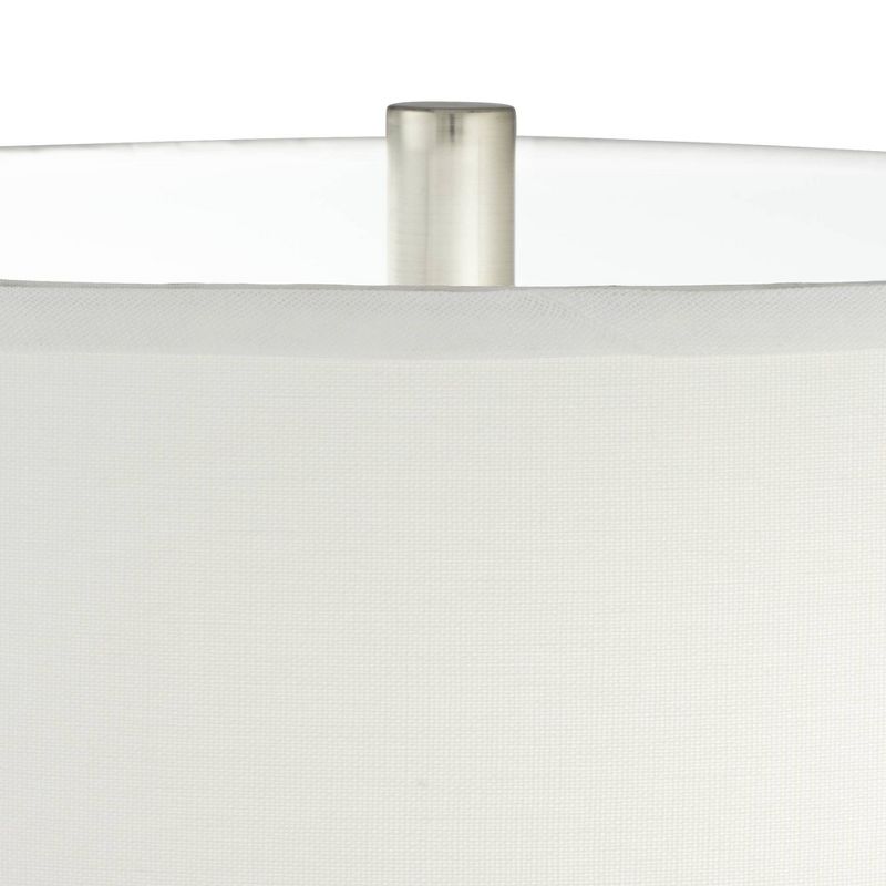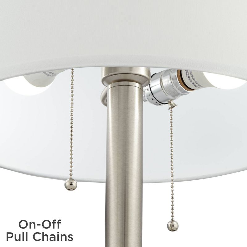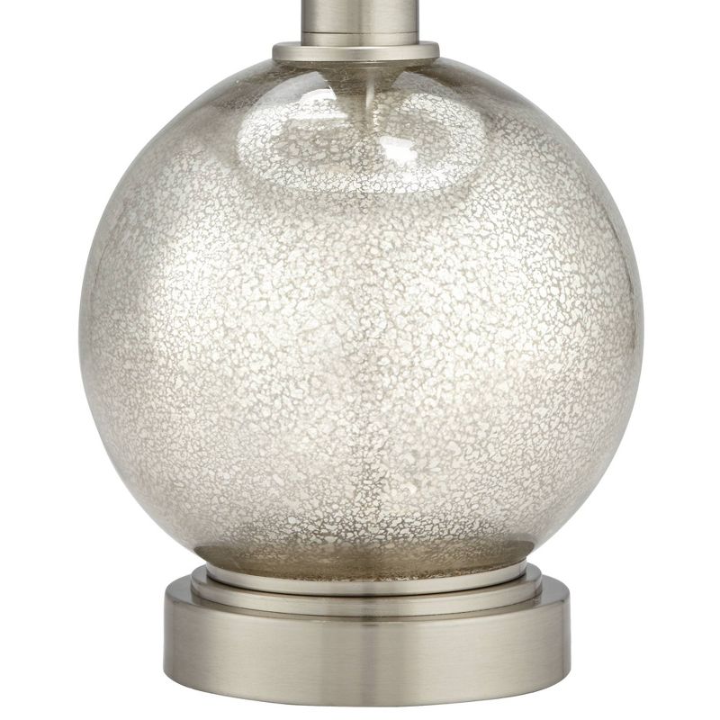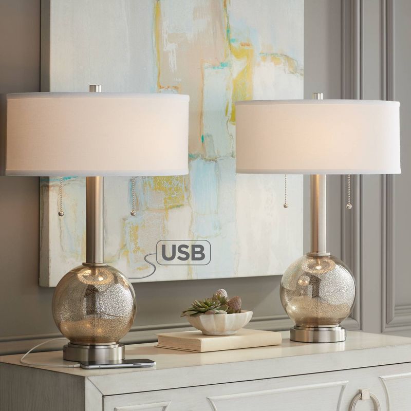 These metal table lamps come in a brushed nickel finish, with a prominent mercury glass orb built into bottom of the frame. White drum shades provide a clean finishing touch to this sophisticated contemporary design. Each lamp is designed to take two light bulbs, with each bulb operated independently by a dangling pull chain switch. A USB port is built into the base of each design.