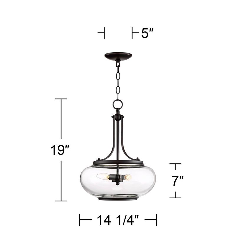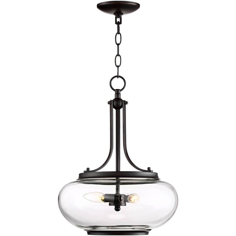 An alluringly contoured shade made from clear glass offers shapely style and a soft shield for three interior bulbs. Paired with an ornamental frame made from oil-rubbed bronze finish metal, it offers a blend of motifs that work perfectly together. This three-light oil-rubbed bronze and glass pendant light pulls together carefully selected elements of a living space decor scheme.