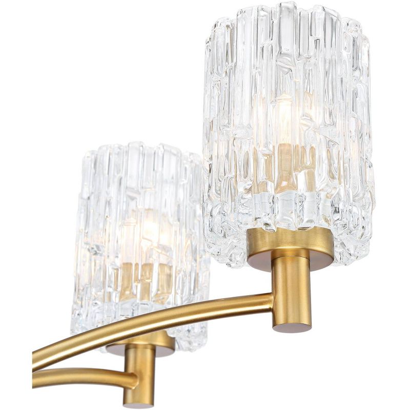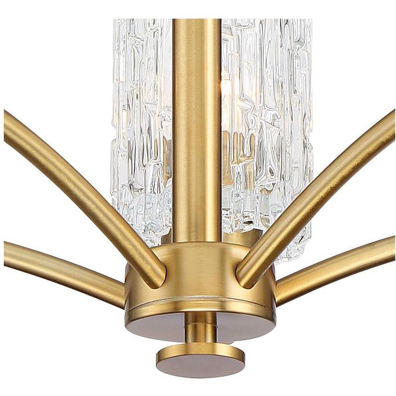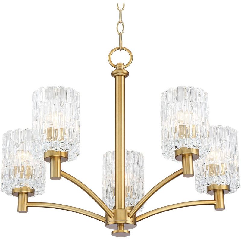 Bring sophisticated style into your home with this contemporary five-light chandelier from the Possini Euro Design brand. Dressed in a warm gold finish, the sleek frame has five upward arms, each supporting a glass cylinder shade with a prismatic ice-like look. Get the lighting you need for your dining space while adding a dose of Mid-Century Modern elegance.