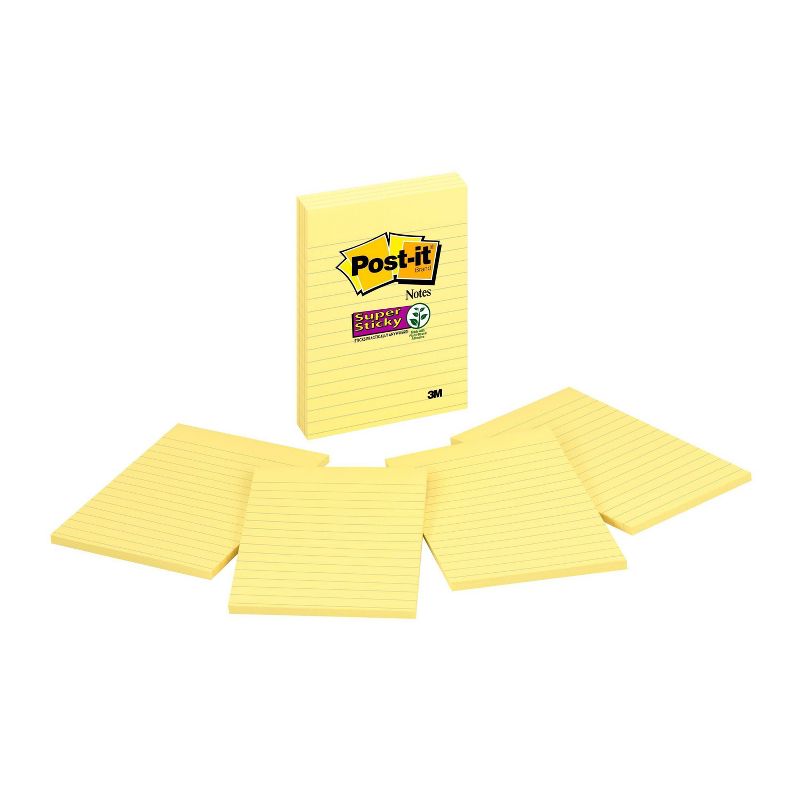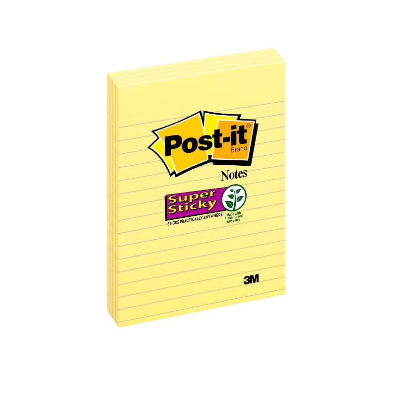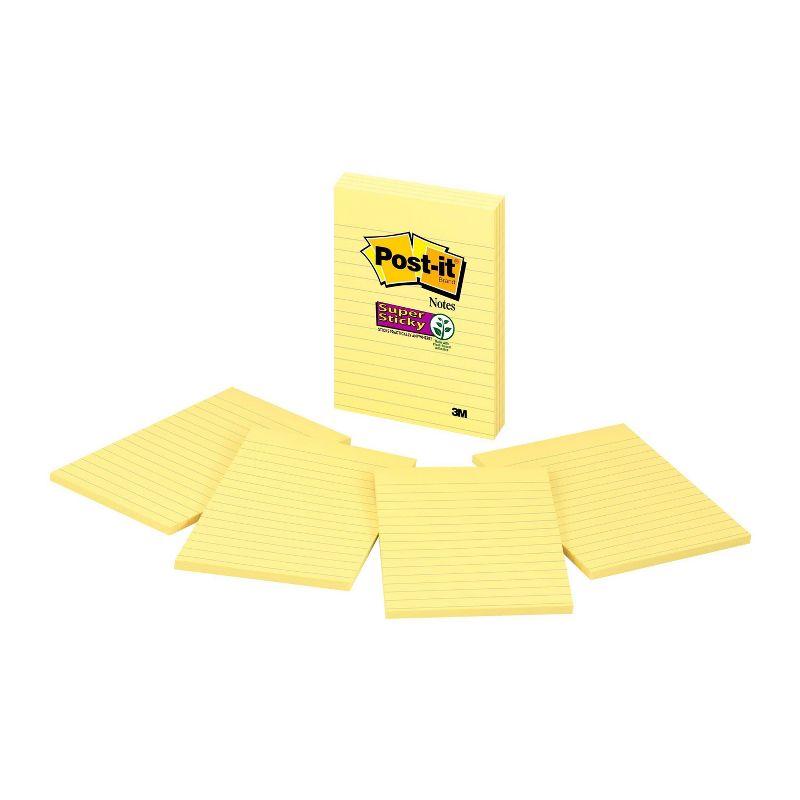 Post it Super Sticky Notes feature 2x the sticking power. 4 in x 6 in size is great for lists or longer notes on doors, windows or walls. Unique adhesive reliably sticks and re sticks so your message can stay front and center. Lined notes are perfect for to do lists. Move your to dos with you throughout the day. Classic Canary Yellow color helps your list stay visible. 4 Pads/Pack, 45 Sheets/Pad.