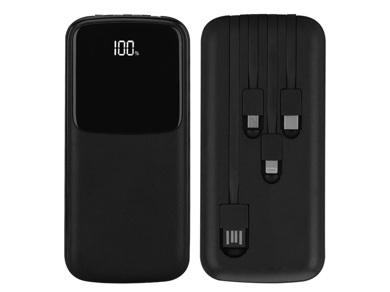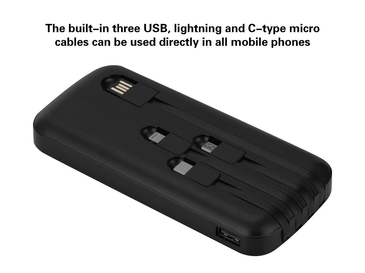 1. The built-in three USB, lightning and C-type micro cables can be used directly in all mobile phones, and there is also an input charging cable that can be directly used to charge the mobile power supply. You don't need to carry an extra charging cable, it is a truly portable mobile backup battery pack.