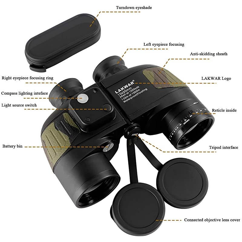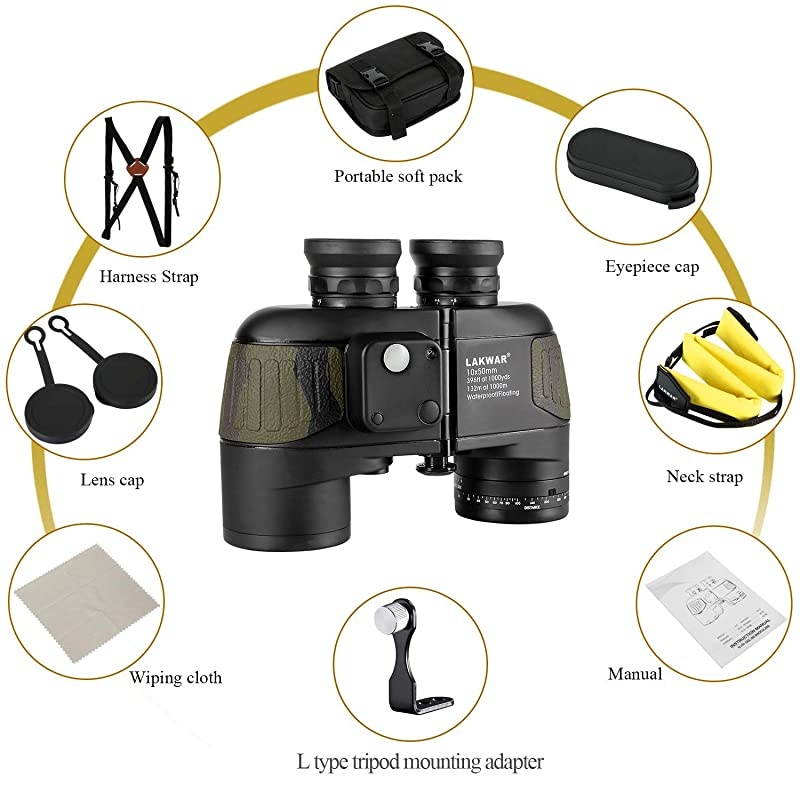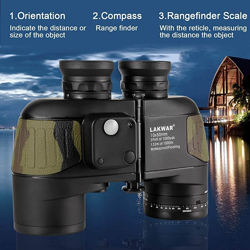 ***** **********Best Quality Guranteed. *****Navigation rangefinder compass- Illuminated Compass built-in for direction location and internal rangefinder for determining distance and size of objects. A switch in the binoculars compact used in darkness to bright the internal rangefinder scale. *****Premium BAK4 prism - Fully multi-coated optics and BAK4 prism produce clear and bright image. Porro prism system provides a wide field of view, improves light transmission. Professional opticsoffering excellent users experience. *****Tripod Connector is included - Tripod adapter fitting to tripod mounting for increased stability, can be used in many conditions, such as for hunting, marine, bird watching, boating, fishing and so on.