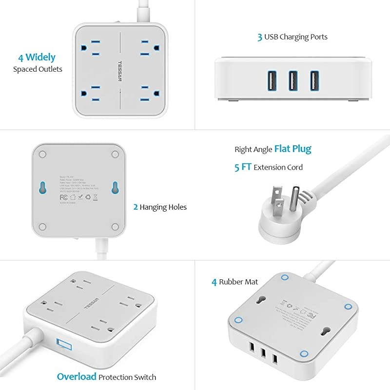 ***** **********Best Quality Guranteed. *****DESKTOP POWER STRIP WITH USB - This 3 prong extension cord with 3 USB ports, provide 5V/ 2.4A max charging current in one port at a time and total 3A/15W output, would charge your cellphone, laptop, tablet, cameras WITHOUT a variety of converters, save your space and make your desktop organized. *****WIDELY SPACED OUTLETS & COMPACT SIZE - It will quadruple the available outlets, wide spaced outlets are separated enough to fit big plugs without blocking each other. Whether as a desktop power strip or a nightstand usb charging station, it can be competent.