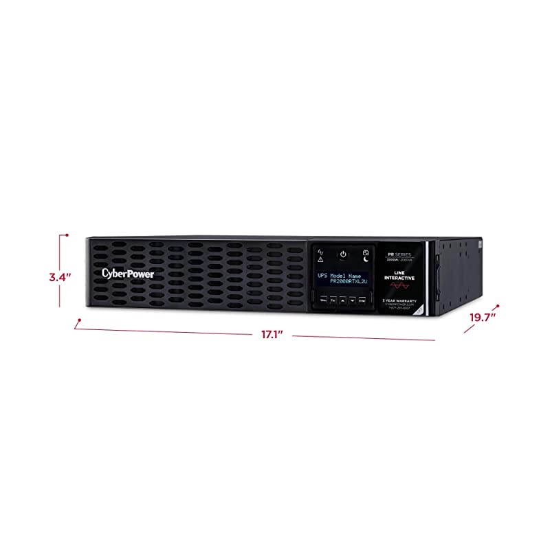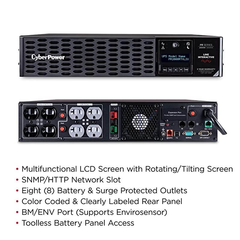 Size: 2000VAThe PR2000RTXL2U is a Smart App Sinewave rack/tower convertible UPS with line-interactive topology surge protection and battery backup Cyber Power's Smart App Sinewave series has sine wave output to eliminate power gaps that can be detected by sensitive equipment and cause unexpected shutdowns The Smart App Sinewave PR2000RTXL2U improves battery life through battery equalization technology and Automatic Voltage Regulation (AVR) which corrects minor power fluctuations without switching to battery power The enhanced chassis design with an easy-to-access tool less front panel captive screws for battery panel access and color-coded rear panel make battery changes and installations simple and fast The PR2000RTXL2U also has an innovative LCD panel that rotates 90 Degree tilts for a better viewing angle and provides information on 47 different settings including UPS stats UPS setup and control management and testing options This model accepts the BP48VP2U02 Extended Battery Module (EBM) for expanded runtime during power outages and the RMCARD205 network management card for remote management and control via a standard web browser or network management system With a 400 000 connected equipment and a three-year you can trust Cyber Power's commitment to the quality of the PR2000RTXL2U