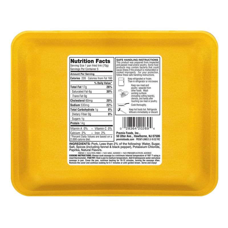 Are you a fan of the classic sweet Italian sausage flavor? Then this pack is perfect for all your favorite grilling, pasta, and stir fry meals! Made from the best ingredients of 100% fresh Italian sausage and natural spices while having no added preservatives, no added MSG and certainly, no artificial ingredients. Pick up the Premio Sweet Italian Sausage Pack today and start cooking your family-favorite Italian Sausage meals!