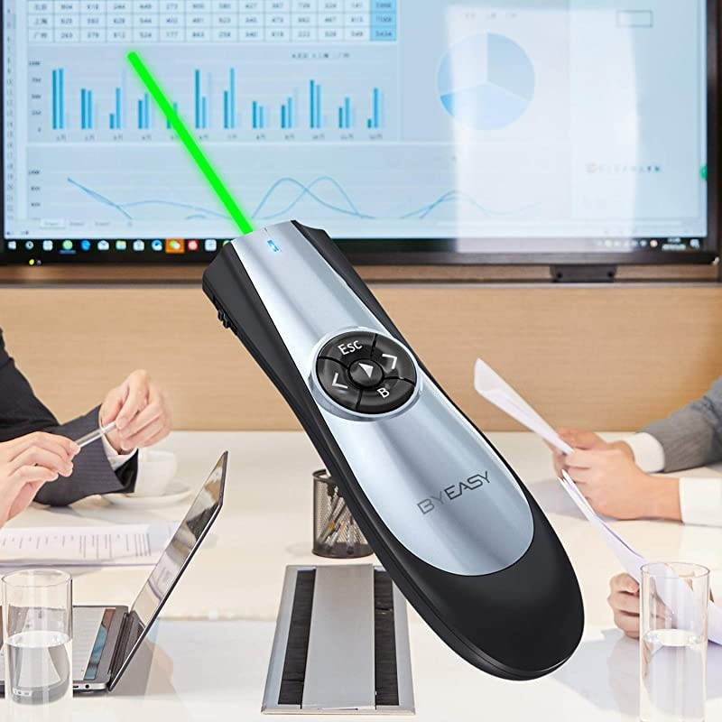 **********Wireless presenter with green laser for navigating through presentations with ease; bright-green laser pointer shows up clearly on almost any background. The presentation clicker with green laser is 10 times brighter than red. *****Wireless Presenter with Ergonomically design and