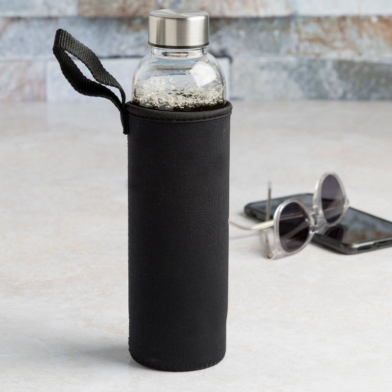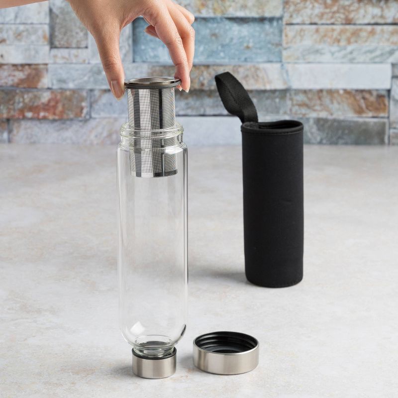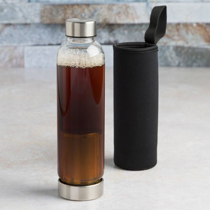 Cold Brew Coffee – on the go. This Cold Brew Bottle is a 20 oz. borosilicate glass coffee bottle with a stainless steel filter and black neoprene sleeve with carrying handle. It has a removable double layer micro-filter built into the base allowing for cold brewing of your favorite coffee, to go. BPA Free and Dishwasher Safe. The cold brew is sweet and delicious. It has 65% less acidity than a hot brewed cup of coffee. The cold brew is a rich, highly caffeinated concentrate. Cold Brew Bottle Instructions •Simply fill the coffee filter with 4 tablespoons of coffee. •Fill the water 1.5 inches from the top. •Store in the fridge for about 24 hours; shake during the brewing process. •You can add a little water and milk after brewing.