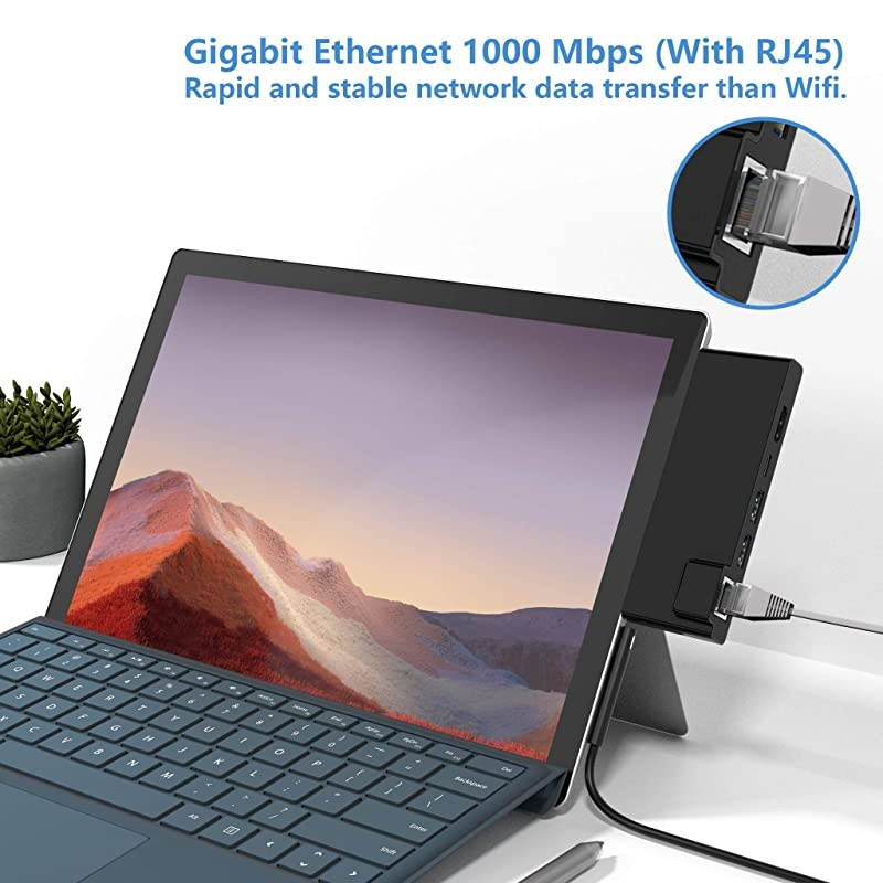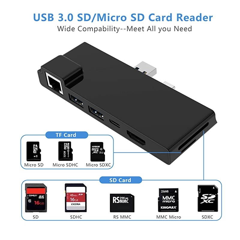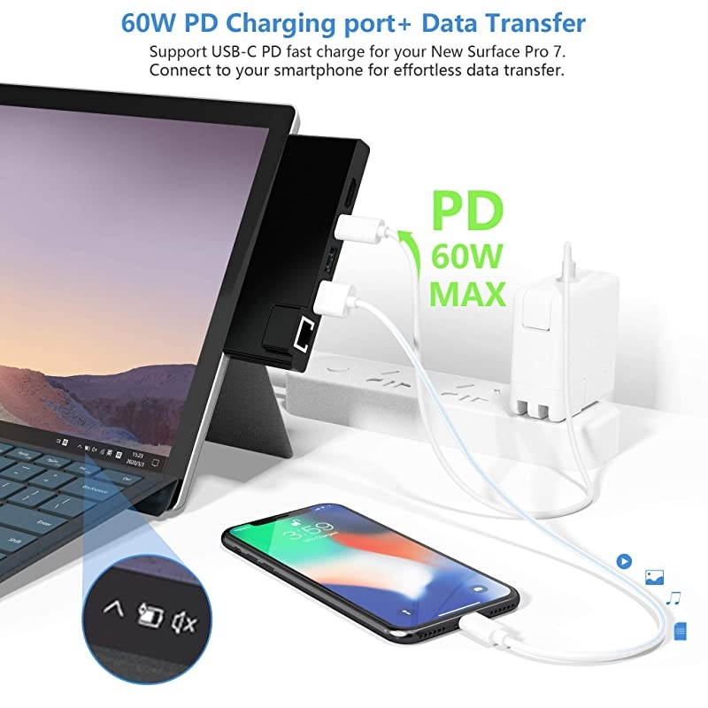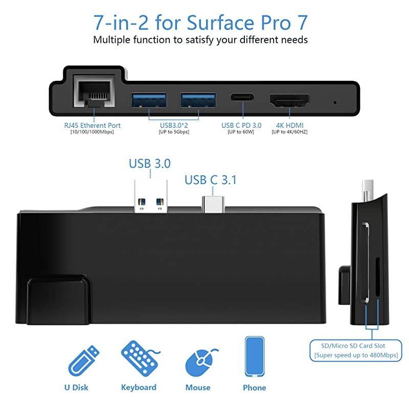 *****Design for Pro 7: Pro 7 Hub Turns the USB-A connection and USB C into 7 ports (HDMI 4K/60Hz, 1000M Gigabit Ethernet LAN USB-C Port(60W PD Charging port+ Data Transfer), 2 x USB-A, SD & MicroSD Card Reader)*Note 1: This pro dock won't fit your very well if you use an protective case on it. Compatible with Microsoft 7.