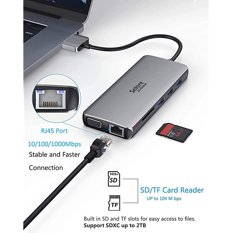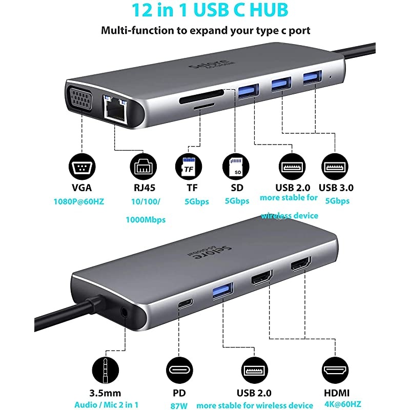 Docking Station: Perfectly combined the function of USB c hub and docking station featuring type c port (87W PD charging), 2*4K HDMI ports, 1*1080P 60HZ VGA port, 2*super speed USB 3.0 Ports (Up to 5Gbps), 2 standard USB 2.0 Ports, Ethernet RJ-45 port, SD/TF card reader and 3. 5mm Audio/mic 2-in-1 jack; Make Your Life More Intelligent; Specially designed for pro Air.