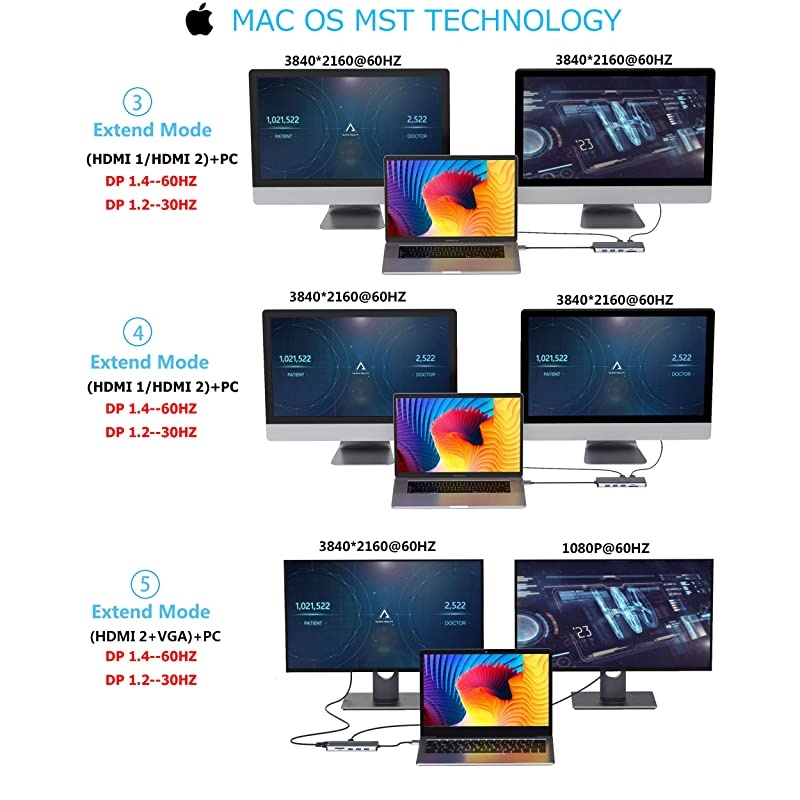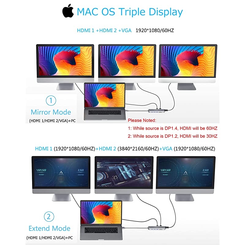 *****Triple display flexibility: Expand triple monitors with our Pro Adapter, USB C to Dual HDMI support 3840 x 2160@60HZ; VGA port support up to 1920 x 1080@60Hz. When using Triple display mode, For Mirro mode 3 monitors' resolution are 1080P @60HZ; For Extend mode the resolution of one of the displays is 4K@60HZ, another two will be limited to 1080P@60HZ. *****Super