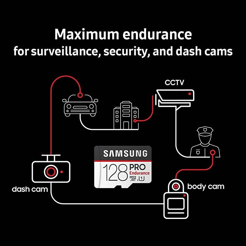 Capacity: 64 GBThe Pro Endurance MicroSDXC Memory Card is specifically designed for video monitoring cameras (dash cams, surveillance & security cams, body cams, etc. ), providing a reliable choice for crucial moments and prolonged write-intensive applications. Record and play up to 43, 800 hours* of 4K and Full HD (1080p) with transfer speeds up to 100MB/s. The memory card is built to stand up to harsh conditions with 5-proofs (water, shock, temperature, X-ray, magnet) to safeguard your critical data. The Pro Endurance 128GB offers a 5-year limited warranty.