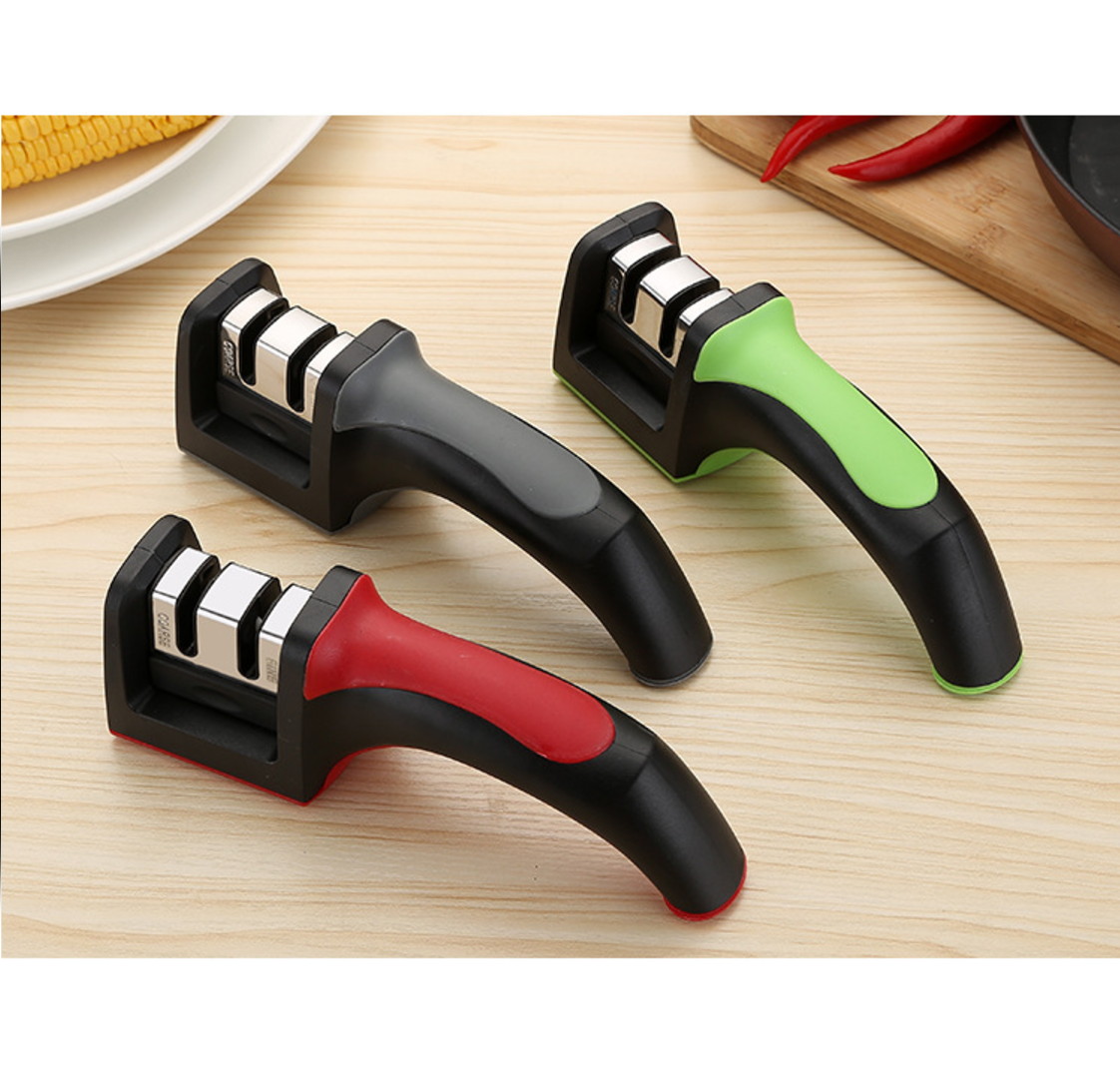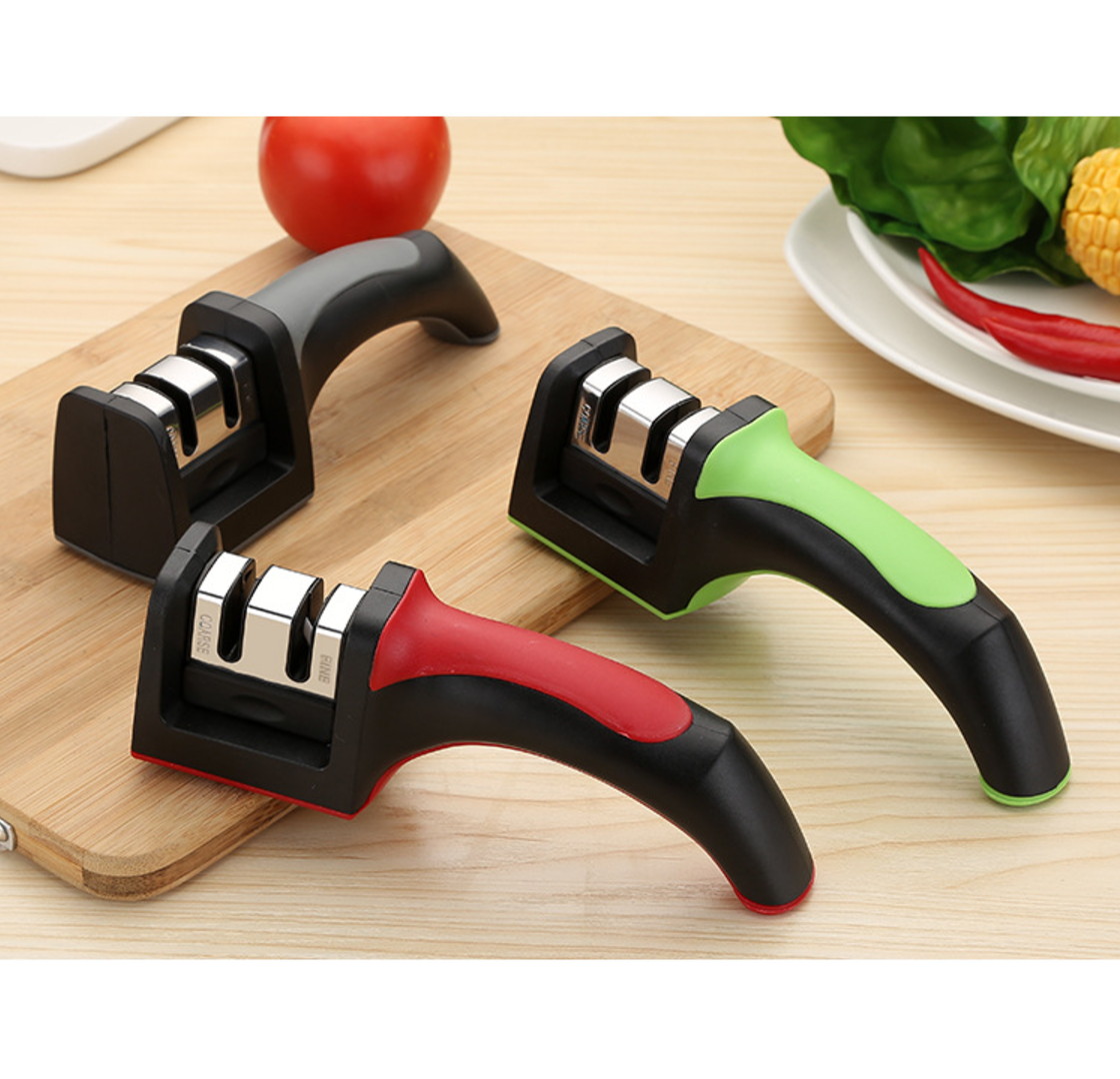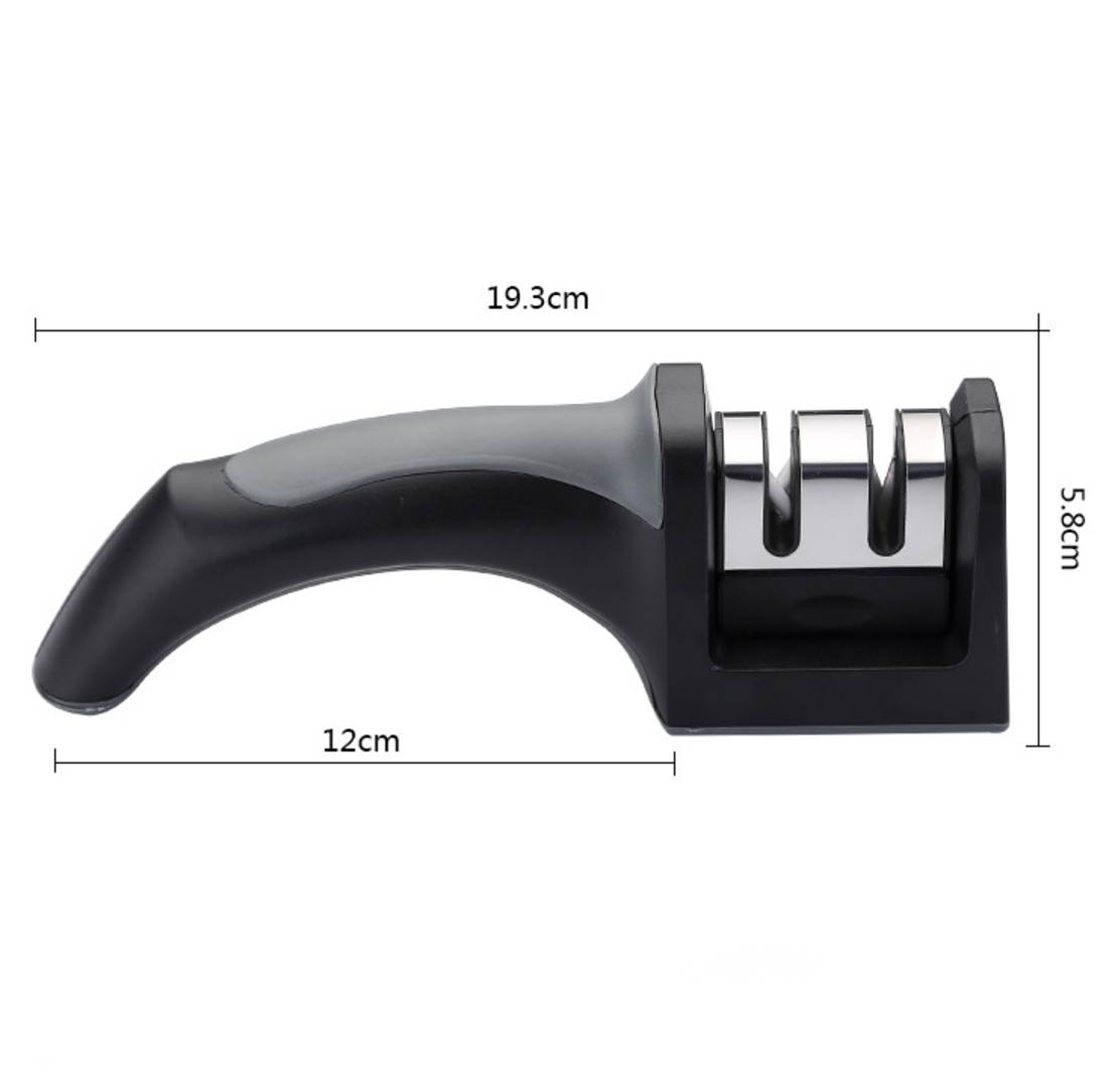 Handle Size (L x W x H): 190mm x 50mm x 55mm Widely used in Stainless Steel kitchen knives, fruit knife, chef's knife the two-stage design, both coarse and fine grinding unique sharpening wheel design, convenient tool back and forth grinding stainless steel tube handle design, stylish and practical stainless steel plate with EVA non-slip base to ensure sharpener security How to