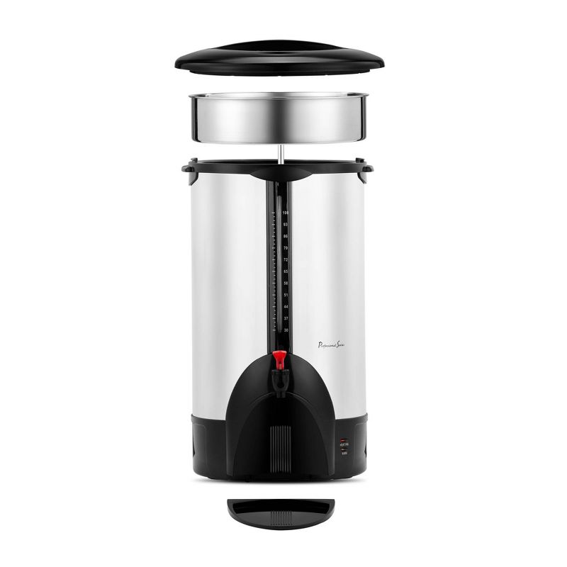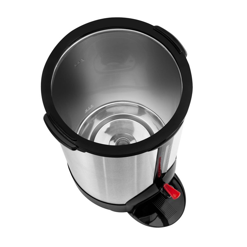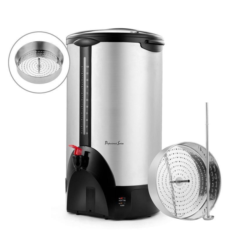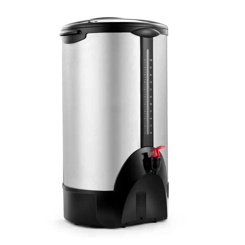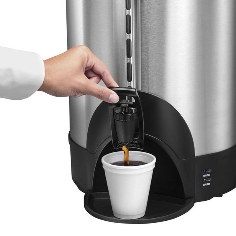 Be the best hostess at a family gathering, for the holidays, or ideal for catering events, hotels, offices, and large meetings. This 100-cup coffee maker urn is made of quality double wall insulated stainless steel with polished finish. With an impressive brewing rate of 1 (5 oz.) cup per minute, this urn offers a 500 oz. total capacity to brew and hold 100 (5 oz.) cups at a time for your serving convenience. The urn's cool touch handles and locking lid make sure beverage service and transport are safe and comfortable. Water gauge and indicator light provide useful information on liquid level, and a dripless spout ensure easy and clean operation. It requires a 120V connection to operate and features 1500W of heating power.