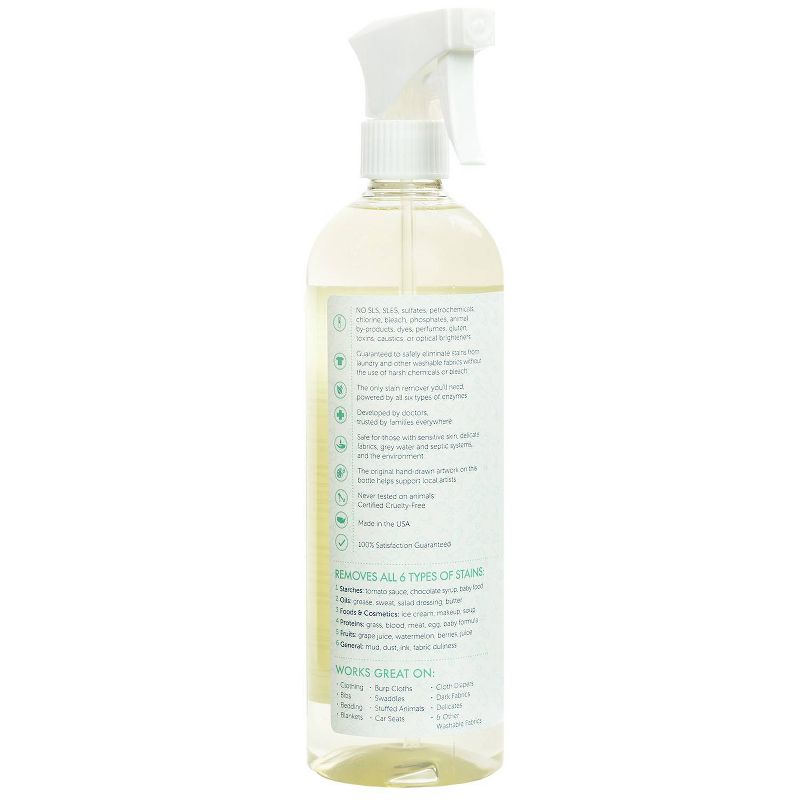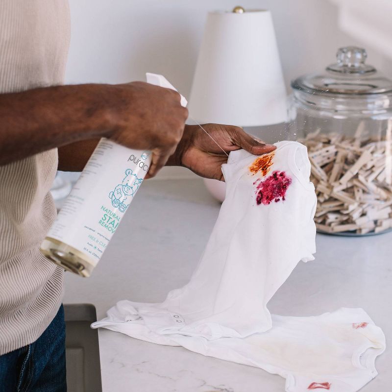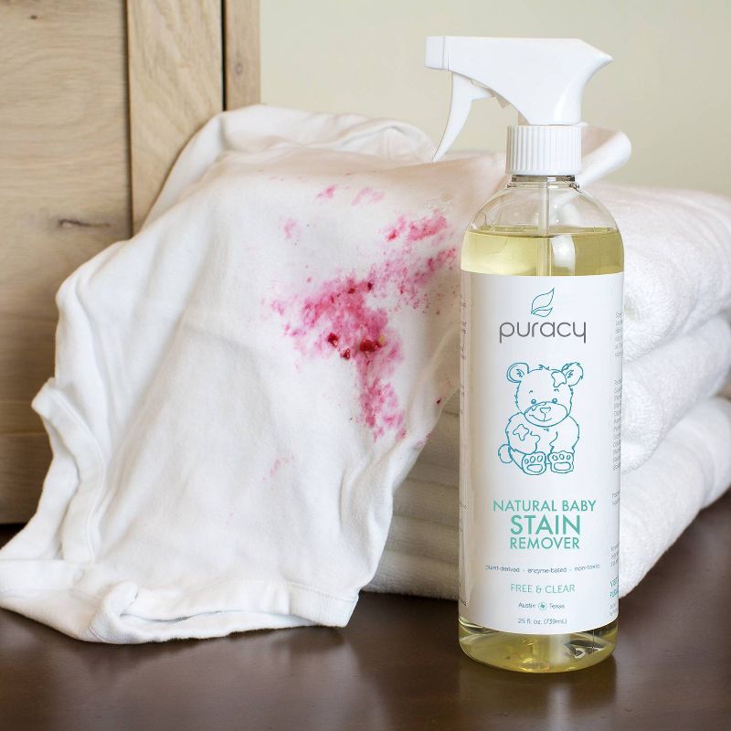 Puracy Natural Baby Stain Remover is the most effective stain and odor remover available, yet safe for all fabrics and 100% clean rinsing. Our bottle features a fine mist sprayer to maximize coverage. It is the only stain remover powered by all six plant-based enzymes: Protease (Protein), Mannanase (Food, Cosmetic), Pectinase (Fruit, Sugar), Amylase (Starch), Lipase (Fat, Oil), Cellulase (General Soil).