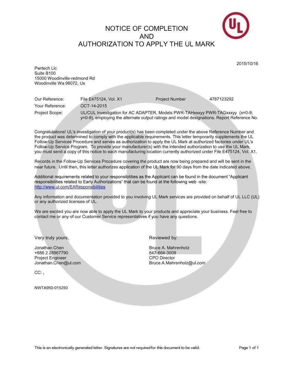 SAFETY / UL LISTED: Tested, Approved and Certified by UL. UL number is unique. UL testing is authorized by OSHA - US Federal Agency