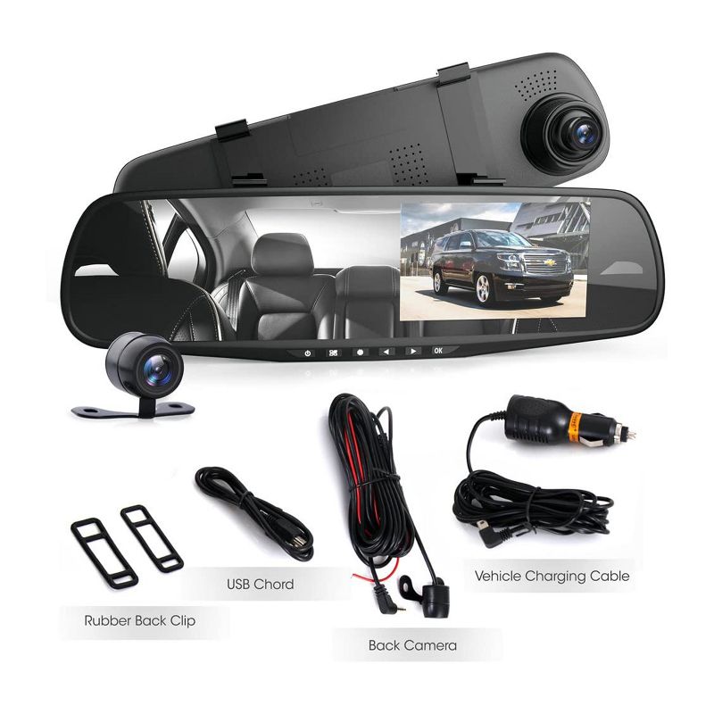 • Includes DVR mirror assembly, backup camera, car power cable, and USB transfer cable