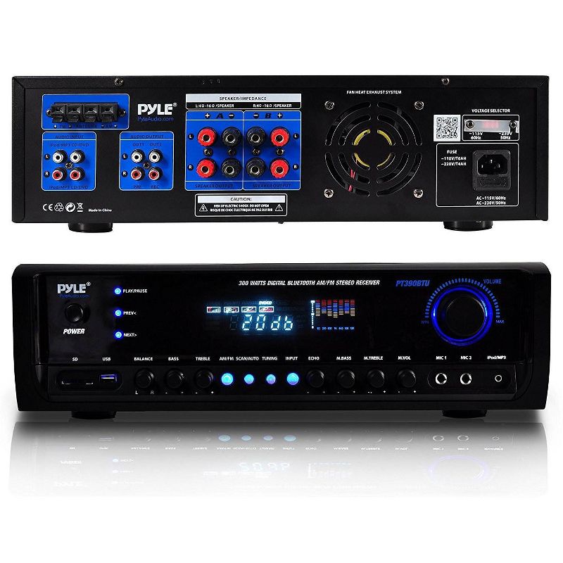 • The sound amplifying device has crisp buttons for audio sources and selector, rotary knob for equalization, mic and master volume adjustments; Features blue LED illuminated buttons to easily adjust the functions even in the dark