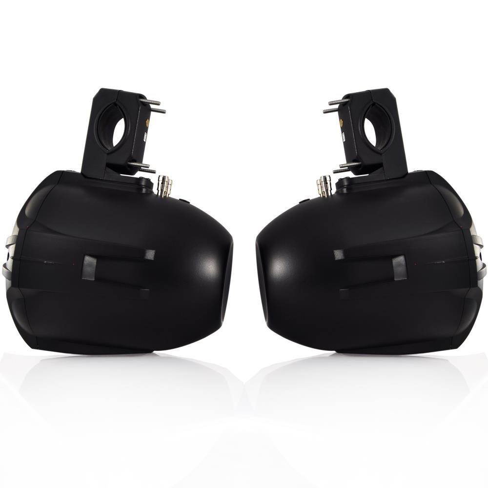 Pyle Model : PLMRWB65LEBDual Marine Wakeboard SpeakersDual Marine Wakeboard Water Resistant Speakers, Built-in Programmable Multi-Color LED Lights, 6.5'' Tower Speakers, 200 Watt, Remote Control, Black Features:Includes (2) Tower SpeakersMarine Grade Water Resistant HousingBullet-Style Speaker Design 2-Way Audio Speaker System Full Range Sound ReproductionLarge Diameter Sound ProjectionBuilt-in Crossover NetworkChrome-Plated Speaker Plug TerminalsSound: 6.5'' Speaker, 1'' Dome TweeterExcellent for Monitor or Surround Sound ApplicationsMounting Bracket and Hardware IncludedFits Mounting Bars up to 2.0'' in DiameterSupport Bar, Tubing, Frame, Roll-Cage MountingHeavy Duty Engineered ABS ConstructionCorrosion and Stain Resistant CoatingProtective Metal Grill CoverColor-Changing LED Lights:Built-in Dancing / Flashing Lights19 Dynamic Color Changing ModesSpeed and Color Brightness AdjustableMulti-Color LED Lights: Red/Green/BlueIncludes LED Lighting Remote ControlTechnical Specs:MAX Power Output: 200 Watt (RMS: 100 Watt)Marine Grade IP Rating: IP-44Butyl Rubber SurroundSubwoofer Cone Material: PolypropyleneTweeter Type: Titanium DomeFrequency Response: 40Hz - 20kHzSensitivity: 90dB4 Ohm Impedance10 oz. Magnet StructureVoice Coils: 1.0''Remote Control Battery Operated: Button Cell (CR2032)Dimensions (H x W x D): 8.5'' x 8.5'' x 9.0''The Pyle Hydra Wakeboard Speakers will add high-powered sound and style to your next ride! These water resistant tower speakers feature built-in multi-color dancing LED lights that are programmable. Make quick adjustments to the color and flashing speeds via the included remote control. Marine grade weatherproof construction and quick connect speaker plug terminals will ensure compatibility with your stereo system -- and allow you to mount the bullet-styled speakers in any convenient location on your vehicle. Additional system features include 2-way audio design with built-in crossover network, titanium dome tweeters, reinforced butyl rubber surrounds and extra wide diameter speaker housing projection -- all equipped to provide you with high-powered, full range stereo sound with impressive bass response! Let the music flow with the Pyle Hydra Tower Speaker Systems.