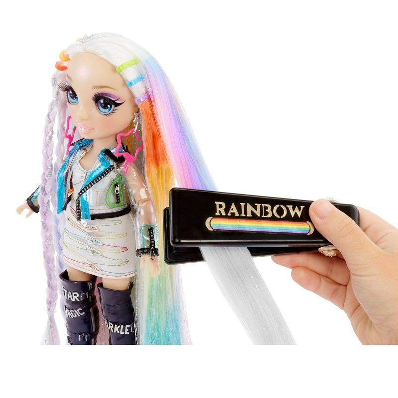 Create beautiful rainbow hair for you and your doll with Rainbow High Hair Studio! 5-in-1 Hair Play includes colorful hair creams, hair glitter gel, ombré hair chalk, style accessories, all for you and your doll. Includes exclusive doll, Amaya Raine. Her gorgeous, extra-long platinum hair has sparkly silver accents, perfect for giving her hair a rainbow makeover. She also has peek-a-boo rainbow hair underneath. Amaya has glam rainbow outfit with a cute top and skirt, translucent jacket, star earrings and showstopping boots. Add color to her hair, then easily wash out to give her new styles again and again. Washable hair color for kids, too. PRO TIP: When first unboxing doll, wash her hair thoroughly to remove gel and let hair dry completely. Then, she's ready for a rainbow makeover.