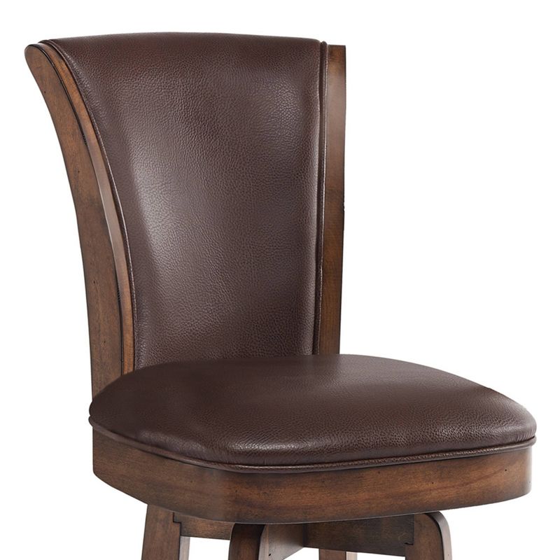 •Swivel stool showcases a rich chestnut wood finish and Kahlua plush faux leather seat and back.