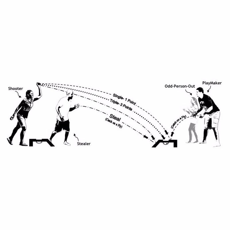 If your toss comes up short and the ball hits the front of the ramp, bouncing backward, the other team can run in and try to catch the ball, scoring an extra point for their team. Play to 15 to see who wins. Each ramp has special grooves to create unpredictable bounces, so you will have to stay on your toes in order to win.